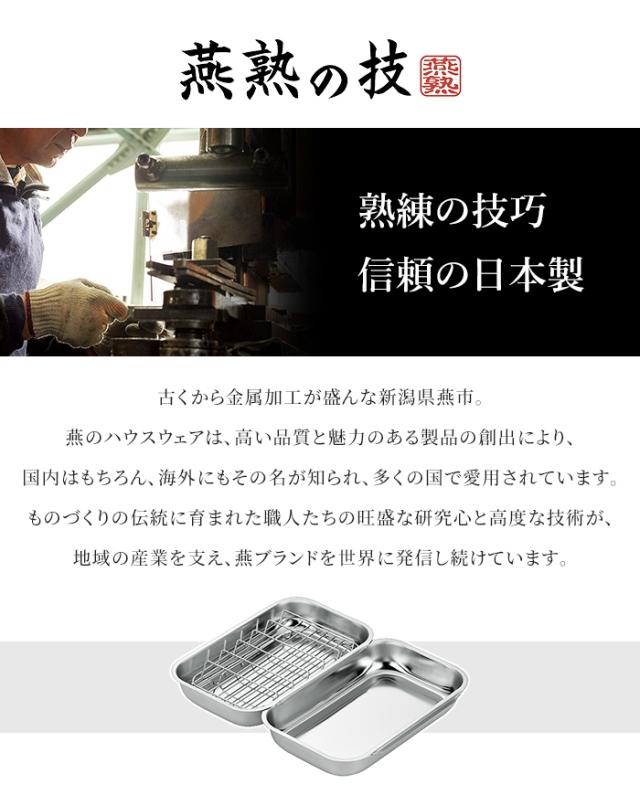 | 揚げ物を立てて置ける油切りアミ付きのステンレスバット。 食材を寝かせずに油切りできるため、余分な油を素早く落とし、揚げたてのサクッとした食感を保ちます。 バット同士は連携して使える設計で、衣付けから油切りまでの作業動線がスムーズ。 天ぷらなどの下ごしらえがしやすく、調理がはかどります。 本体は丈夫で耐久性に優れたステンレス製。 使用後は重ねて収納でき、省スペースで収納可能です。 金属加工の町・燕三条で丁寧に作られた日本製。 揚げ物はもちろん、下ごしらえや調理用バットとして幅広く活躍します。 |