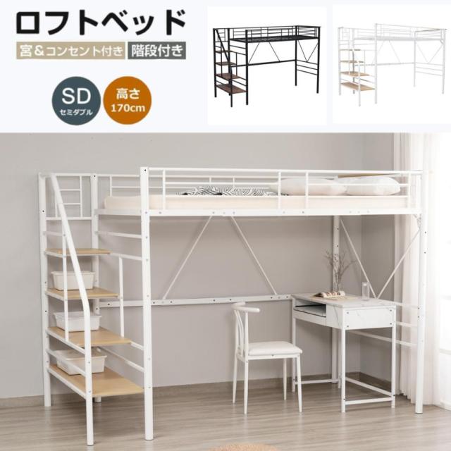 ロフトベッド ハイタイプ 階段付き ハイベッド SD セミダブル シングルコンセント 宮付き システムベッド 収納 耐震 パイプベッド ロフト システムベット