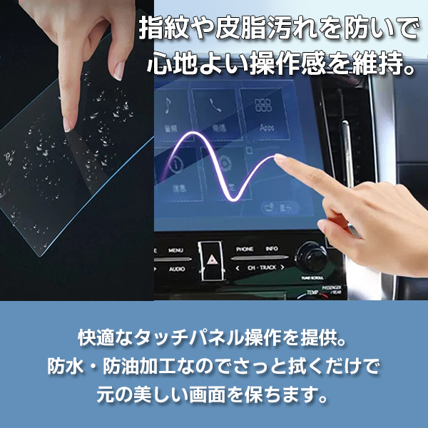 なめらかな指触りと快適な操作性を保ちつつ、汚れ・傷等からカーナビの液晶を保護。