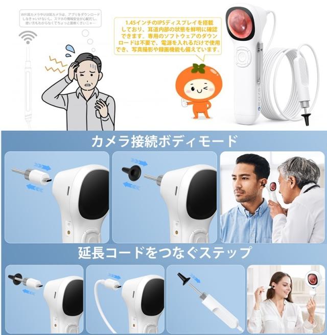 イヤースコープ2種類の接続モード搭載:本製品は、用途に応じて選べる2つの接続モードを搭載しています。手持ちモード:カメラを本体に直接接続し、そのまま耳道を観察。手軽に使えてスムーズな操作が可能。延長ケーブルモード:カメラを延長ケーブルに接続することで、より自由な角度で観察可能。自分一人でも簡単に耳の奥まで確認できます!