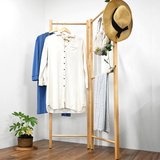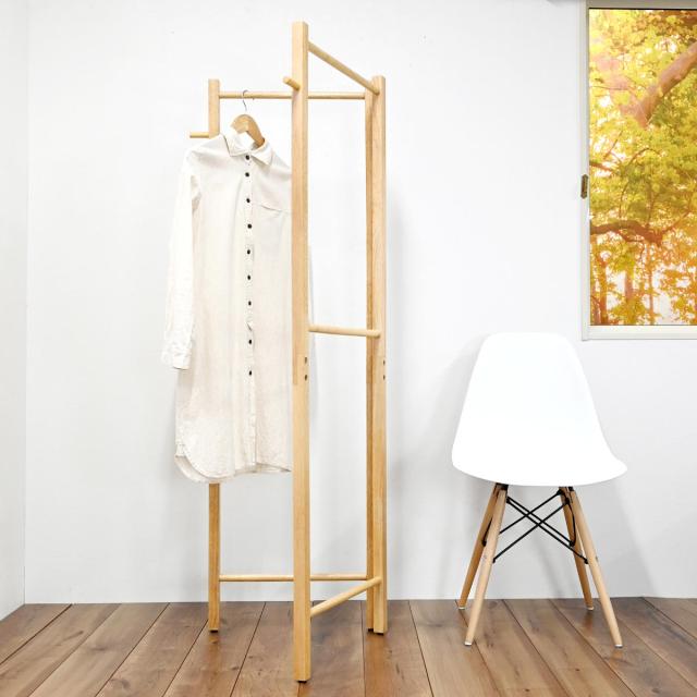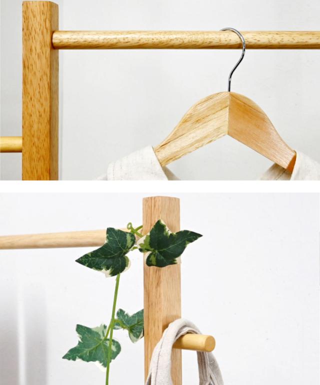 天然木の優しい風合いが魅力のハンガーラックです。無駄を省いたシンプルなデザインなので、玄関やリビング、寝室や子ども部屋など様々なシーンで便利にお使いいただけます。