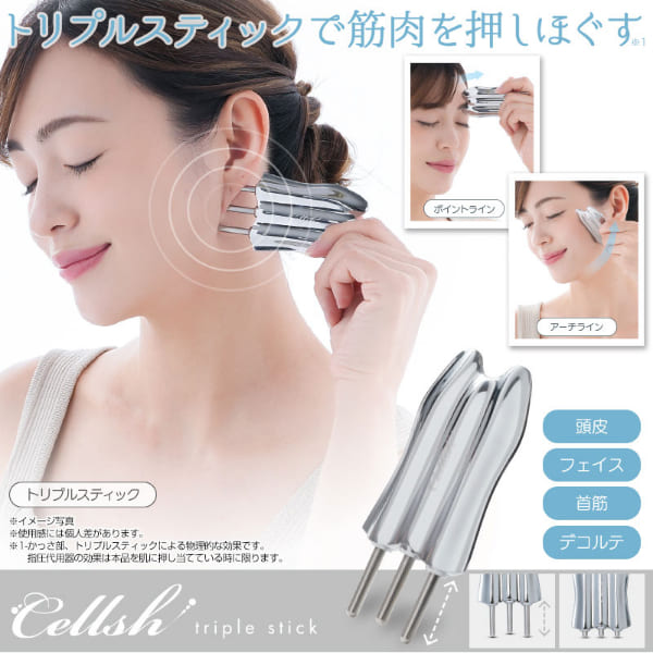 メール便・送料無料・Cellsh トリプルスティック 美顔器 かっさ セルシュ かっさスティック マッサージ 顔 フェイスライン 首元 首筋 デコルテ リフトアップ 表情筋 頭皮 リラックス かっさマッサージ かっさマッサージプレート スパチュラ 便利 グッズ おすすめ 人気