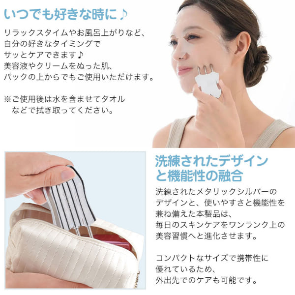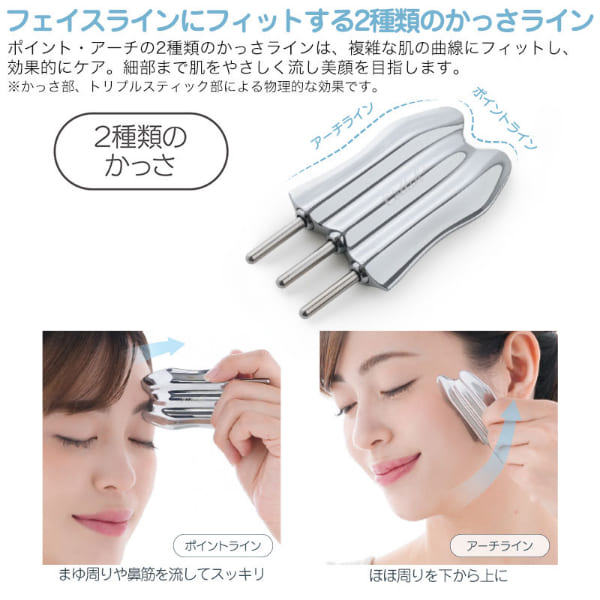 毎日のセルフケアを、サロン級の心地よさに。3本のスティックと2種類のかっさラインで“押す”と“流す”を同時に叶えるトータルケアアイテムです。内部のバネ構造により上下に伸縮し、程よい刺激で顔まわりや頭皮の筋肉を押しほぐします。さらに、ポイントラインとアーチラインの2種のかっさが肌の曲線にフィットし、フェイスラインや首、デコルテまでやさしく流すようにケア。コンパクトで持ち運びやすく、自宅はもちろん外出先でも使用可能。美容液やクリームの上からも使え、日常のスキンケアをワンランク上の美容習慣へと導きます。