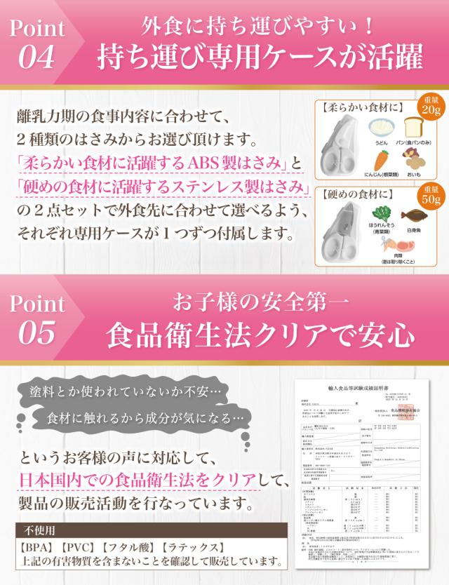 様々なメーカーから赤ちゃんのご飯をカットするグッズとして ” 離乳食用はさみ ”や” 離乳食用フードカッター ”など 日本製/中国製など様々に販売されていますが、 Rozallyの 離乳食はさみ は”こだわり”が一味違います。 「プラ製/ステンレス製のセット」で月齢や食材に合わせて使い分けができ、 「それぞれ専用ケース付」で持ち運び時に大活躍致します。 |