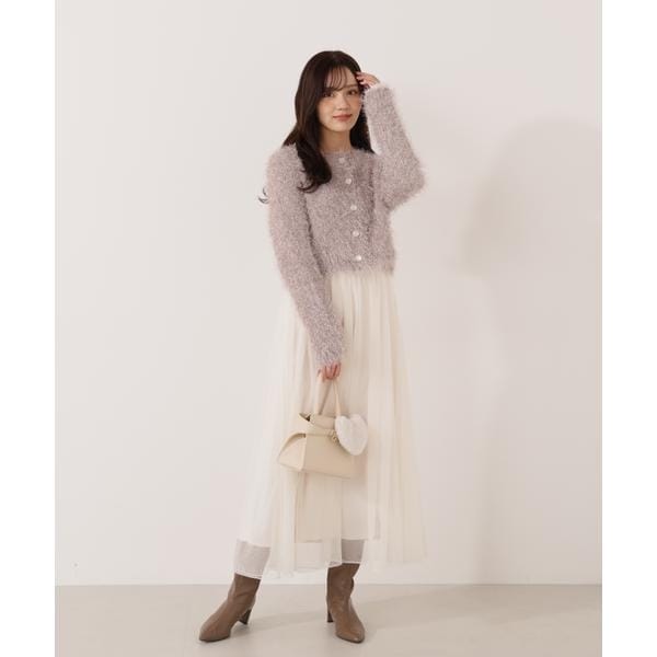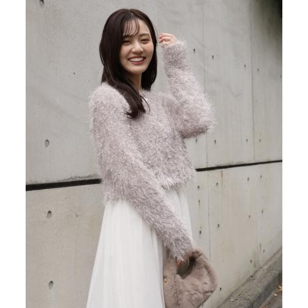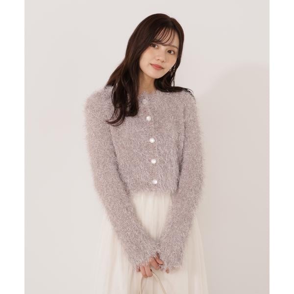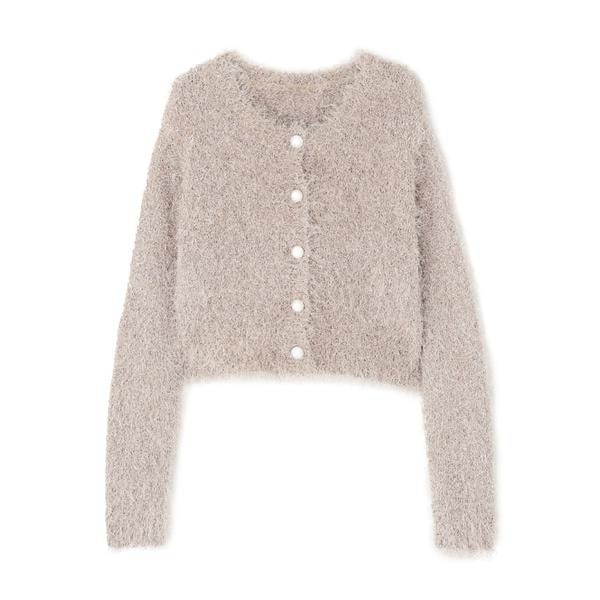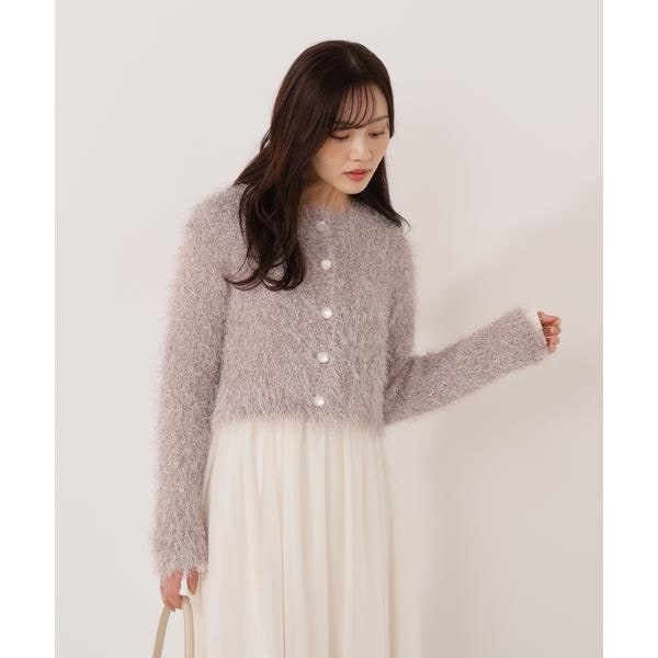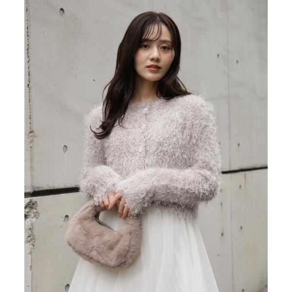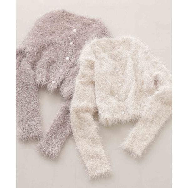 キラキラとした毛足のあるニットカーディガン。ざっくりとしたシルエットが愛らしく、一枚で華やかな印象を与えてくれます。柔らかな風合いが心地よく、前ボタンを留めるとプルオーバーとしても活躍。デイリーからお出かけシーンまで着回せます。