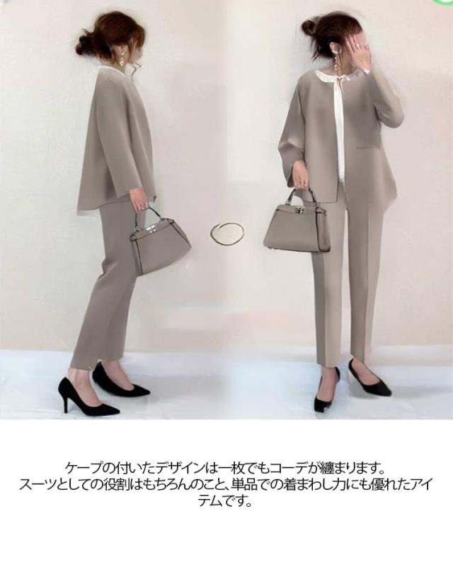 | 入学式・卒業式 パンツスーツ 2点セット ケープの付いたデザインは一枚でもコーデが纏まります。 スーツとしての役割はもちろんのこと、単品での着まわし力にも優れたアイテムです。 センタープレスの入ったパンツは、丈感も絶妙で美脚効果間違いなしです。 春から初夏にかけては、卒業式(卒園式)や入学式(入園式)などのお子さまの大切な行事や、就職活動や入社式などのビジネスシーンに。 また、参観日などの学校行事や同窓会、結婚式やお葬式などのフォーマルシーンだけでなく通勤時のオフィスカジュアルなど、オールシーズンどのようなシーンにもお使いいただけます。 ご家庭で手洗い可能!簡単にお手入れできるウォッシャブルスーツ。 | |