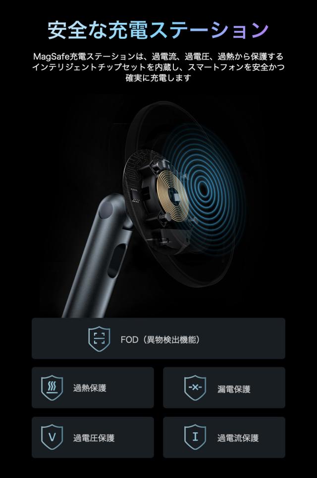 充電モジュールは押すとポップアップし、スマートフォンのカメラレンズを保護します。iPhoneを充電しながら仕事やエンターテイメントを楽しむことができ、両手が自由になります。MagSafe充電ステーションは、過電流、過電圧、過熱から保護するインテリジェントチップセットを内蔵し、スマートフォンを安全かつ確実に充電します。温度が過度に上昇すると、充電が自動的に一時停止され、スマートフォンを保護します。MagSafeケースを装着して充電できます(ケースなしでの使用を推奨)。より強力な磁気を得るには、通常のケースではなくMagSafeケースをご使用ください。