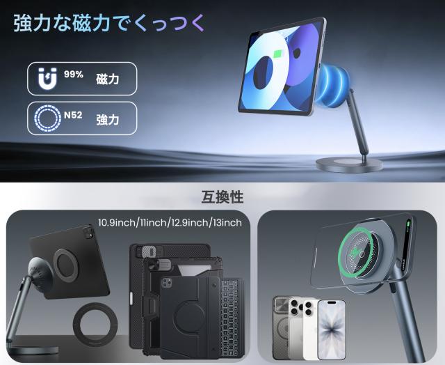 | キーワード | Nillkin マグネット式 iPad スタンド デスク用 MagSafe ワイヤレス iPhone 充電スタンド 360°回転ベース 調節可能なアルミ製タブレットホルダー 仕事、オフィス、自宅、キッチンでの使用に最適 ipad a16/10世代、ipad air、iPad pro、iPad mini、galaxy z fold 7、MacBook pro |