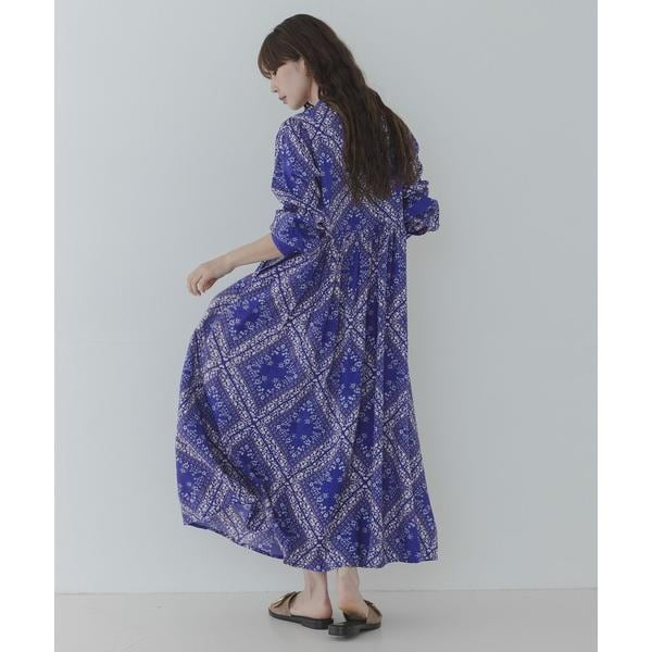 繊細なボタニカルモチーフのパネル柄プリントをシックで落ち着いたブラックと、鮮やかで目を惹くブルーのカラーリングでまとめたプリントワンピース。