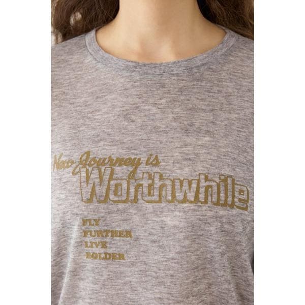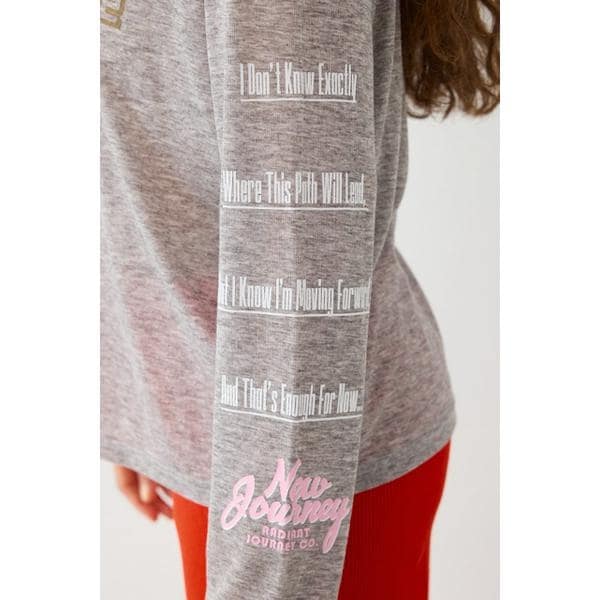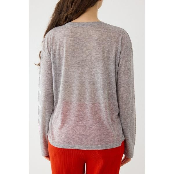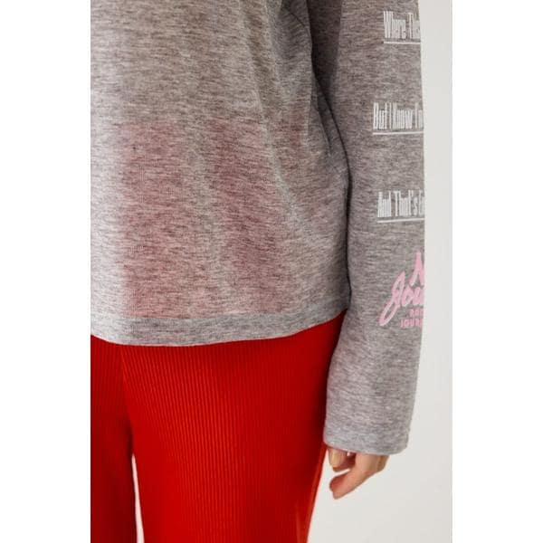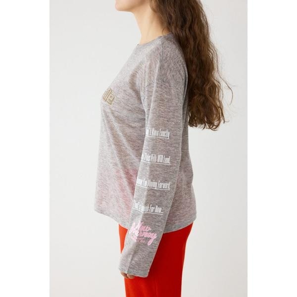 ■ポイント透け感のあるシアー天竺素材のロンTです。ベーシックなボディーカラー展開でスタイリングに取り入れやすいアイテムです。■ディテール袖、フロントに配色がかわいいメッセージプリント入り。キャミソールの上にトップスとして着るのはもちろん、Tシャツとレイヤードして袖のプリントをのぞかせる着こなしもおすすめです。■スタイリング半袖の裏毛トップスやTシャツとレイヤードするのがおすすめです。■生地透け感のあるシアー天竺を使用。柔らかく、軽やかな着心地が特徴です。■透け感:あり■裏 地:なし■伸縮性:ややあり■光沢感:なし※お取り扱い上のご注意プリント箇所は着用・洗濯によリ白化、剥離する場合があります。プリント箇所は湿った状態で重ねて放置すると色移りの原因となりますので注意してください。[注意事項]※画像の商品はサンプルです。実際の商品と仕様、加工が若干異なる場合があります。※画像の商品は光の照射や角度、お使いのモニター環境により、実物と色味が異なる場合がございます。※着用、お取り扱いの際は、アテンションタグをご確認ください。
