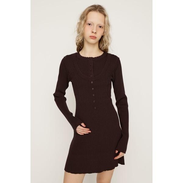 【FRONT BUTTON FRILL S/OP】■POINTレイヤード風のデザインと、胸元のフリルレースが可愛いニットワンピース。程よいフレアシルエットと編み地の切り替えがスタイルアップを叶え、1枚でしっかり華やぐアイテムです。■DETAIL着やすいブラウンとブラックの2色展開で、デイリーにも特別な日にも活躍します。程よく広がるフレアシルエットが体のラインを拾いにくく、ストレスフリーで着用頂けます。■STYLINGロングブーツを合わせて、王道ガーリーコーディネートがおすすめ。着るだけでコーディネートが完成する、主役級ワンピース。■FABRIC/MATERIALサラッとした着心地のポリエステルレーヨンを使用。■透け感:なし■光沢感:なし■伸縮性:あり■裏 地:なし※お取り扱い上のご注意・洗濯機表示の場合はネットに入れて弱水流で洗って下さい。・手洗いの場合はもみ洗いを避けて軽く押し洗いして下さい。・洗濯後は、速やかに形を整え干して下さい。・丈の長い製品、袖など伸びやすい箇所はハンガーで支えたり、平干しをすることで型崩れを防止できます。[注意事項]※画像の商品はサンプルです。実際の商品と仕様、加工が若干異なる場合があります。※画像の商品は光の照射や角度、お使いのモニター環境により、実物と色味が異なる場合がございます。※着用、お取り扱いの際は、アテンションタグをご確認ください。※一部予約商品につきましては生産上の都合によりお届け予定日や店頭発売と前後する場合もございます。※追加生産商品は、一部の店舗、通販で販売中の場合がございます。予めご了承下さい。