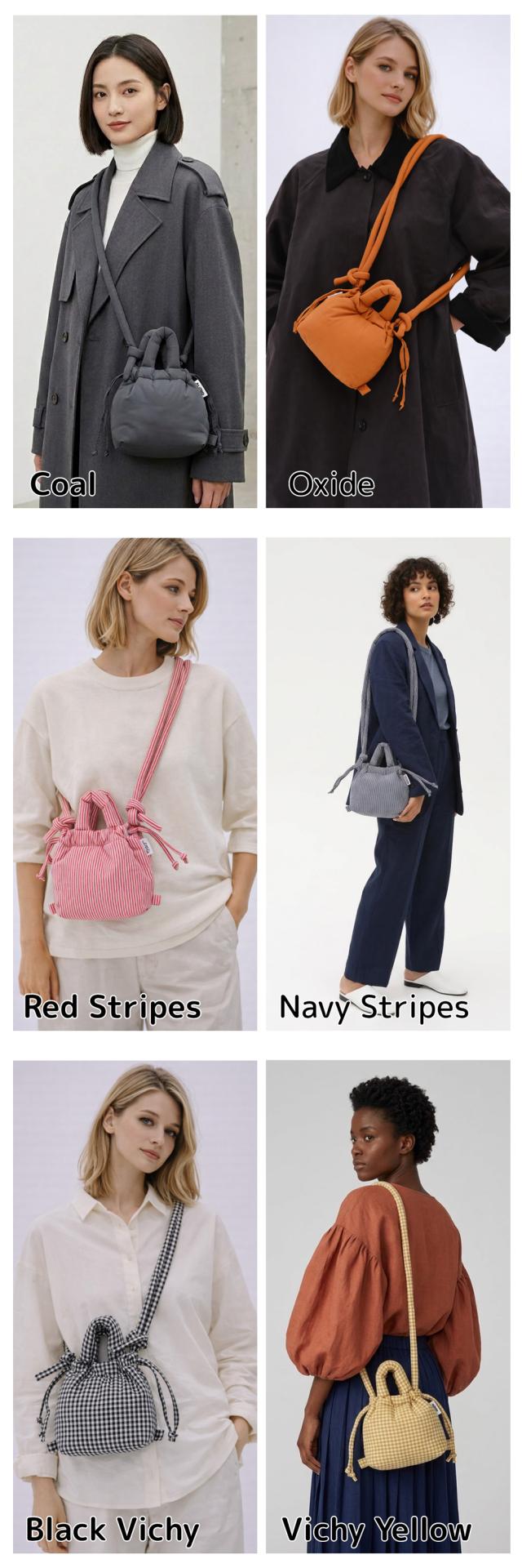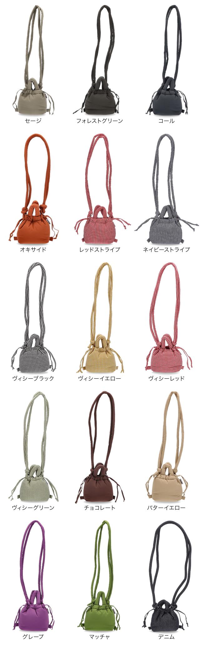 コーラル、コバルトブルー、ブラック、サンド、ライム、ライラック、レッド、チェリーレッド、ペールピンク、ソフトピーチ、ピンク、グリーン、セージ、フォレストグリーン、コール、オキサイド、レッドストライプ、ネイビーストライプ、ヴィシーブラック、ヴィシーイエロー、ヴィシーレッド、ヴィシーグリーン、チョコレート、バターイエロー、グレープ、マッチャ、デニム