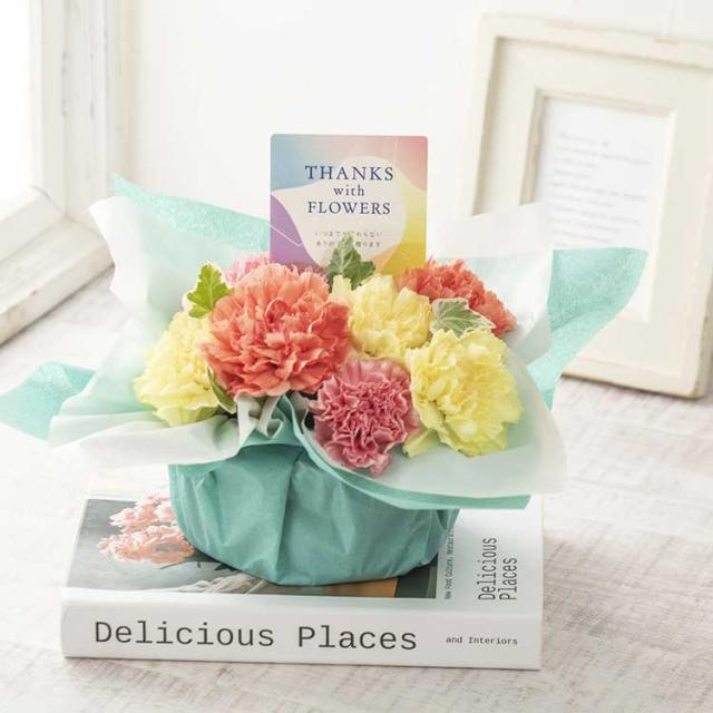 カーネーション(オレンジ×2、イエロー×3、ピンク×2) 、グリーン、ラッピング、メッセージピック