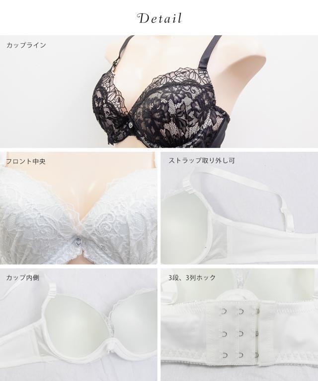裏地無し、透け感有り、伸縮性有り 【カップタイプ】3/4カップ・モールドカップ(丸みを形成した厚みのあるカップです)、【ホックの数】3段3列、【パット付属】なし、【パットポケット】なし、【ストラップ取外し】可、【ワイヤー】あり、※タンブル乾燥禁止