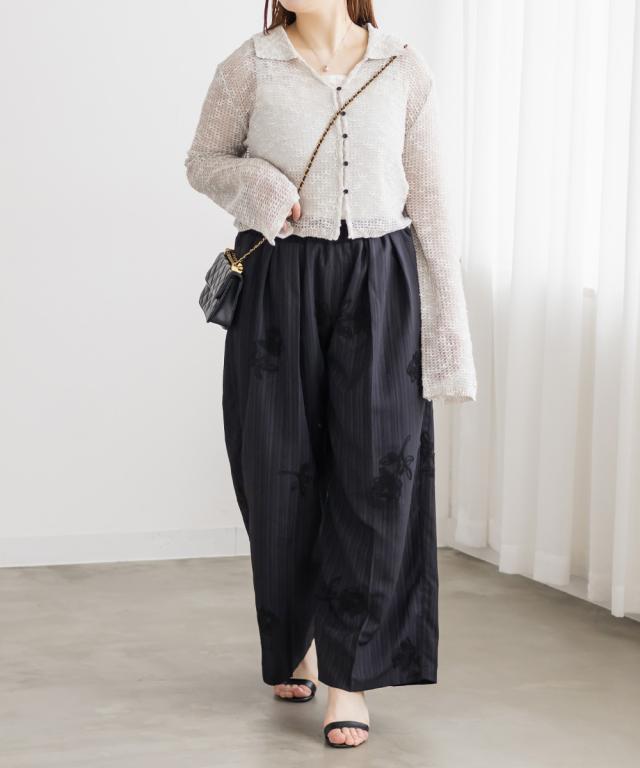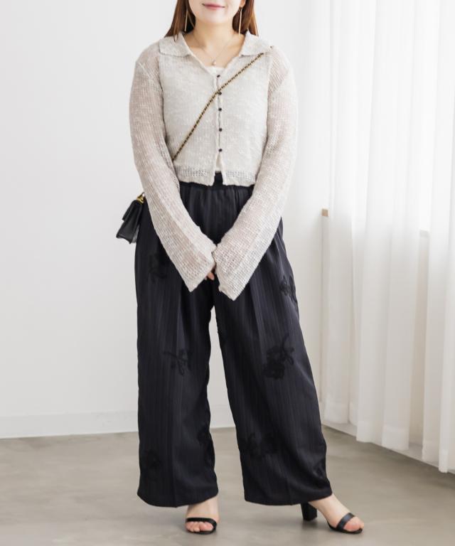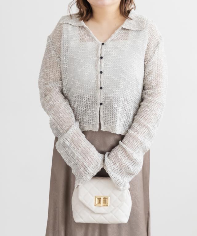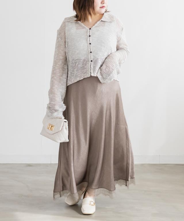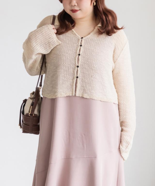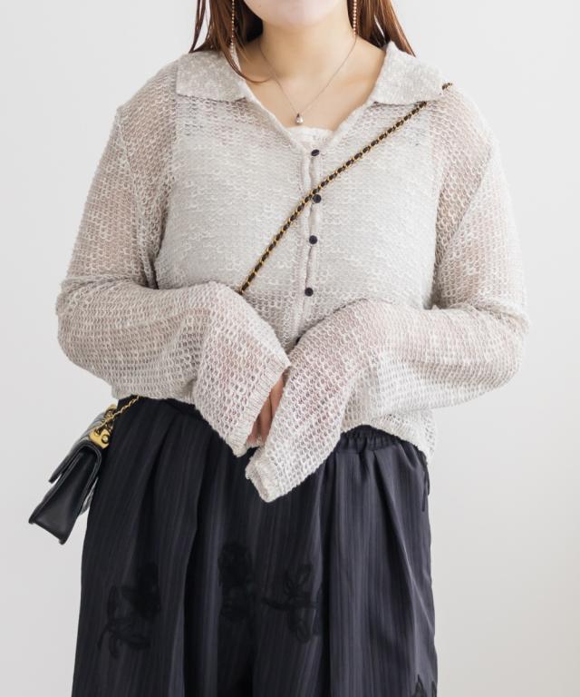 | 3Lサイズを着用しました。身幅や袖まわりに程よいゆとりがあり、全体的にちょうどいい着心地でした。軽やかなシアー素材でさらっと羽織れるので、季節の変わり目にもぴったりです♪ 襟付きデザインなのでカーディガンでもきちんと感があり、カジュアルすぎず女性らしい印象で着られました。 程よい透け感があるのでインナーとのレイヤードも楽しめて、シンプルなコーデにさっと羽織るだけで抜け感のあるスタイリングに仕上がります◎ パンツ合わせで大人カジュアルに、スカート合わせでフェミニンに着るのもかわいくておすすめです。 |