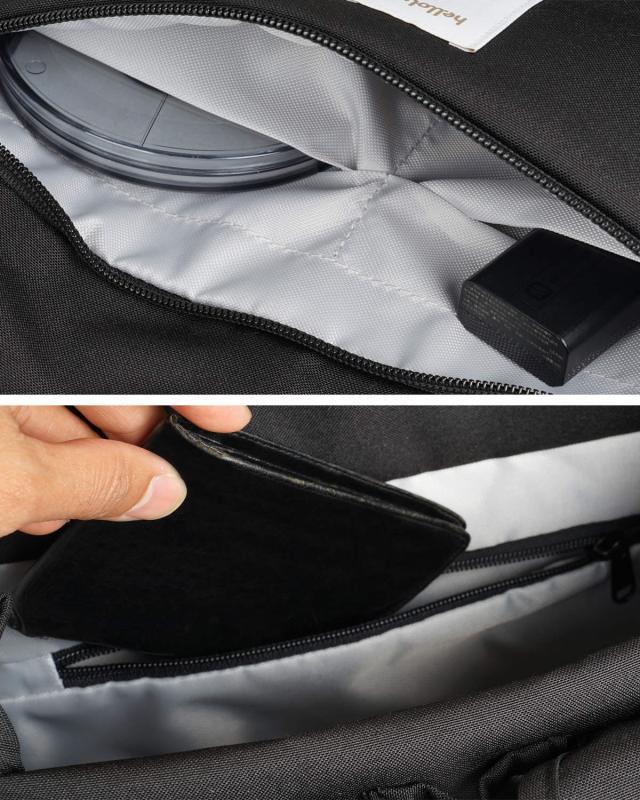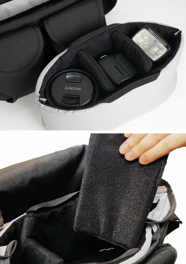 フラップ部分とメイン収納の内側にはファスナーポケットが付いています。予備のレンズや小物類の収納にぴったりです。