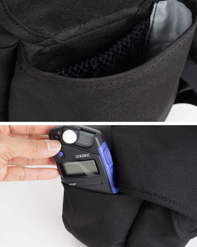 前面にはマグネット開閉式のスリップポケット、サイドには2つのポケットが付いています。予備バッテリーやSDカード、メンテナンス用品など細かなアクセサリー類もきちんと収納できます。