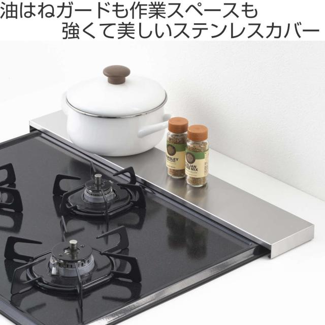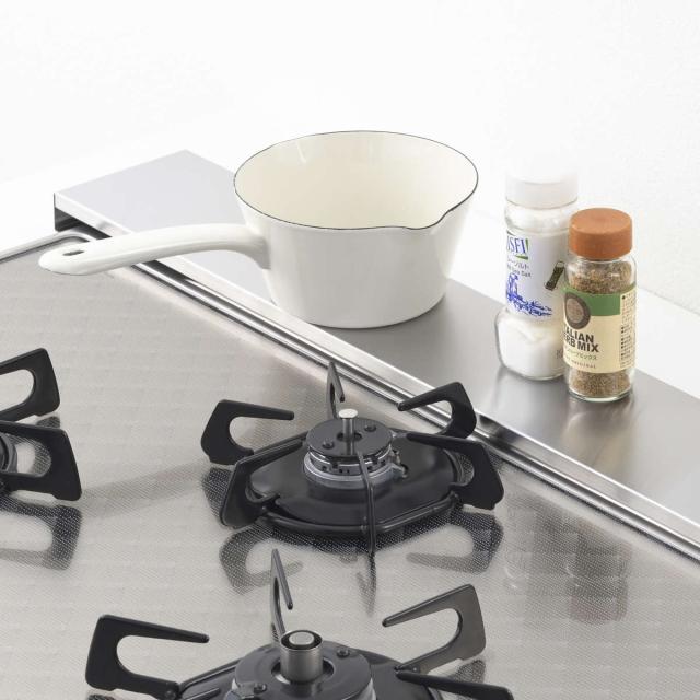 フラットな天面で調味料や鍋のフタをサッとちょい置きでき、耐荷重10kgのしっかりした強度で重めの調理器具も安心して置けます。コンロ奥のスペースを有効活用でき、調理中の作業効率が自然と上がります。