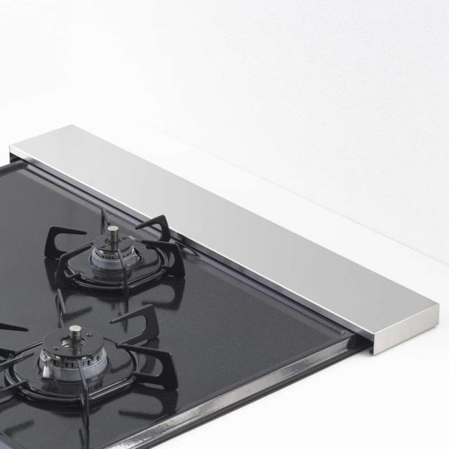 油はねや食材の落下を防ぐステンレス製排気口カバーです。一般的な2〜3口のビルトインコンロに対応し、排気口まわりを清潔に保ちます。圧迫感を抑えた低めのフォルムと、どんなキッチンにも馴染むシンプルなデザインが特徴です。