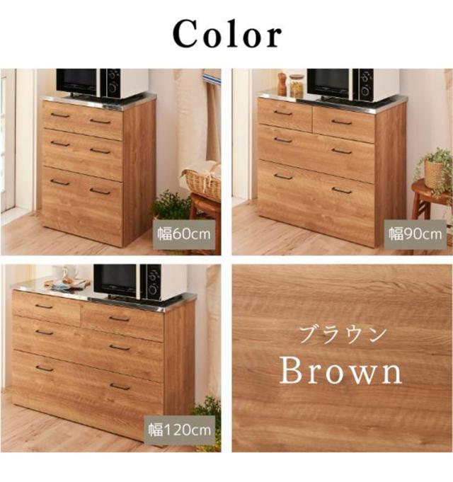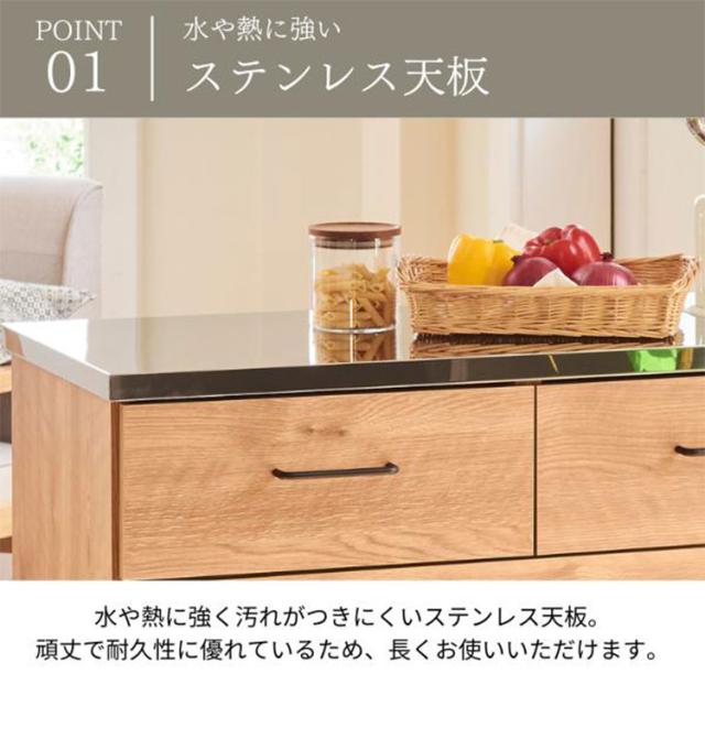 水や熱に強いステンレス天板のキッチンカウンター。汚れがサッと拭き取れます。引出しは1段目にはカトラリーなど小物の収納に便利です。全段フルスライドレール仕様で奥の収納物を取り出し易い仕様です。背面化粧仕上げですので間仕切りとしても使用できます。