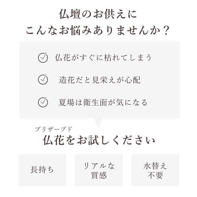 「仏花がすぐに枯れてしまい、お手入れが煩雑」「夏場は水の管理など衛生面が気になる」…といったお悩みがよく聞かれます。