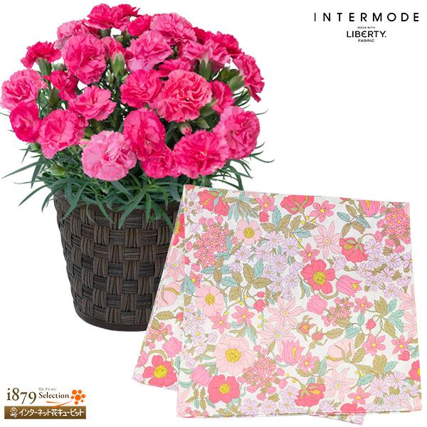 【母の日 産直花鉢植え】 女性 母 祖母 誕生日 お祝い 記念日 プレゼント 花キューピットのカーネーションの鉢植え(ピンク)と【リバティプリント】ラージサイズハンカチ mt04-711629