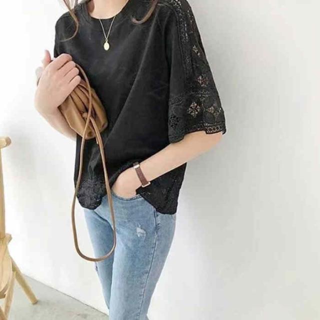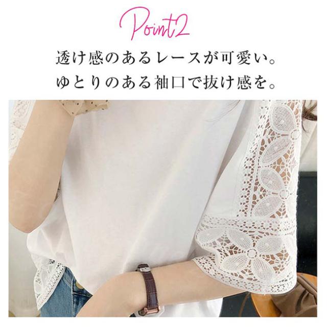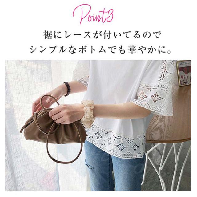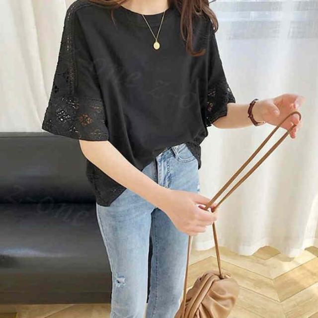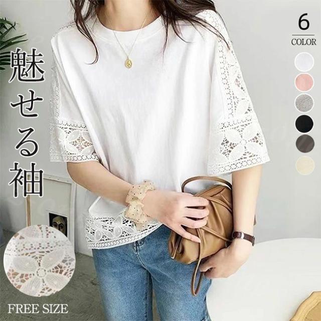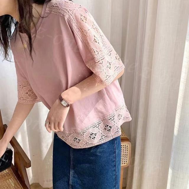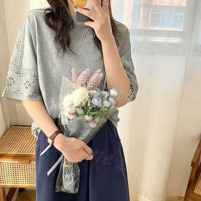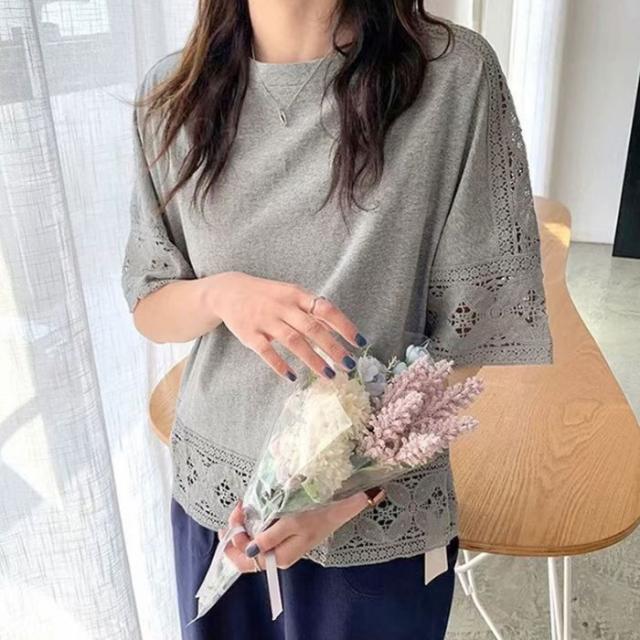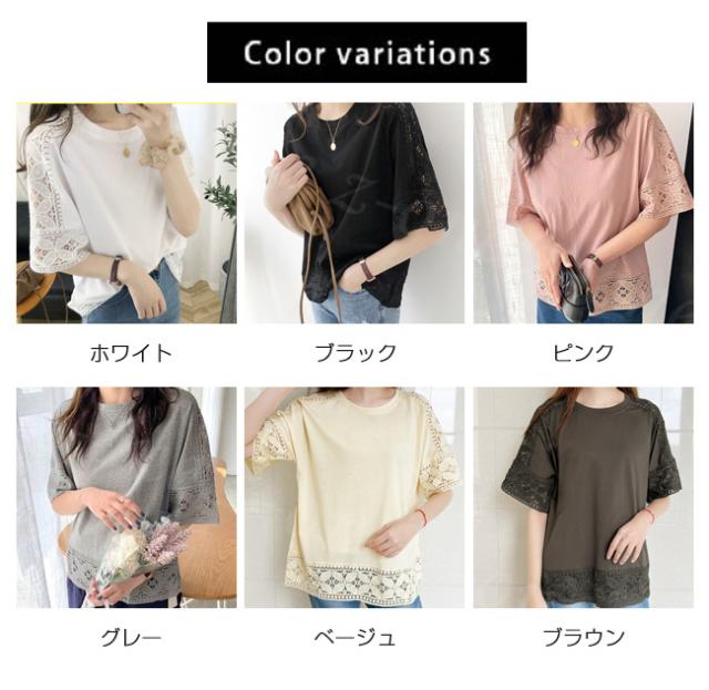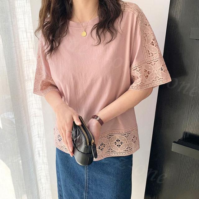 【1点1,750円!2点購入&クーポンで】ブラウス 半袖 トップス ゆったり 春新作 送料無料 レース 刺繍 透かし ロングT tシャツ レディース ラウンドネック 無地 体型カバー 上品 きれいめ 入学式 入園式