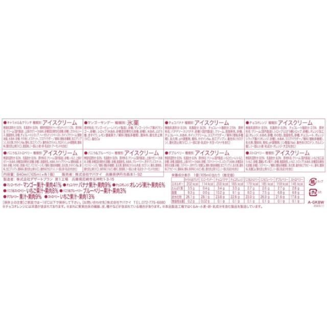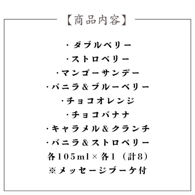 <内容量>ダブルベリー・ストロベリー・マンゴーサンデー・バニラ&ブルーベリー・チョコオレンジ・チョコバナナ・キャラメル&クランチ・バニラ&ストロベリー各105ml×各1 (計8)※メッセージブーケ付