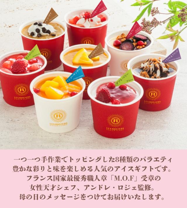 <セールスポイント>一つ一つ手作業でトッピングした8種類のバラエティ豊かな彩りと味を楽しめる人気のアイスギフトです。フランス国家最優秀職人章「M.O.F」受章の女性天才シェフ、アンドレ・ロジェ監修。母の日のメッセージをつけてお届けいたします。