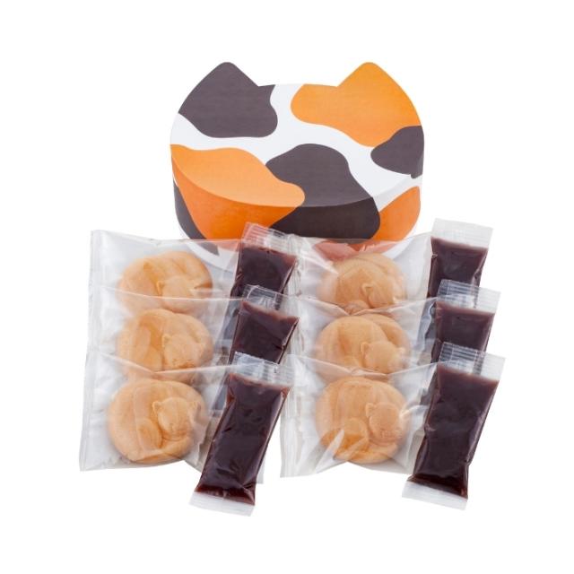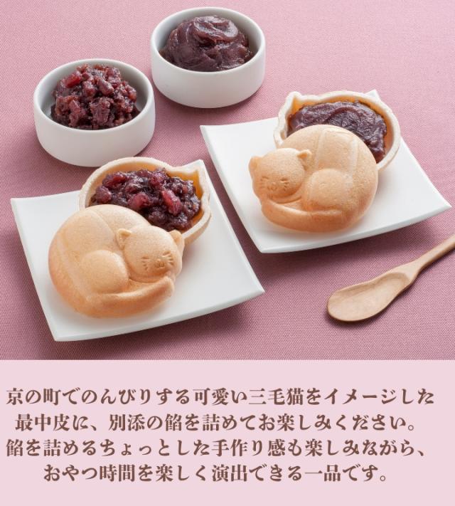 <商品説明>京の町でのんびりする可愛い三毛猫をイメージした最中皮に、別添の餡を詰めてお楽しみください。餡を詰めるちょっとした手作り感も楽しみながら、おやつ時間を楽しく演出できる一品です。