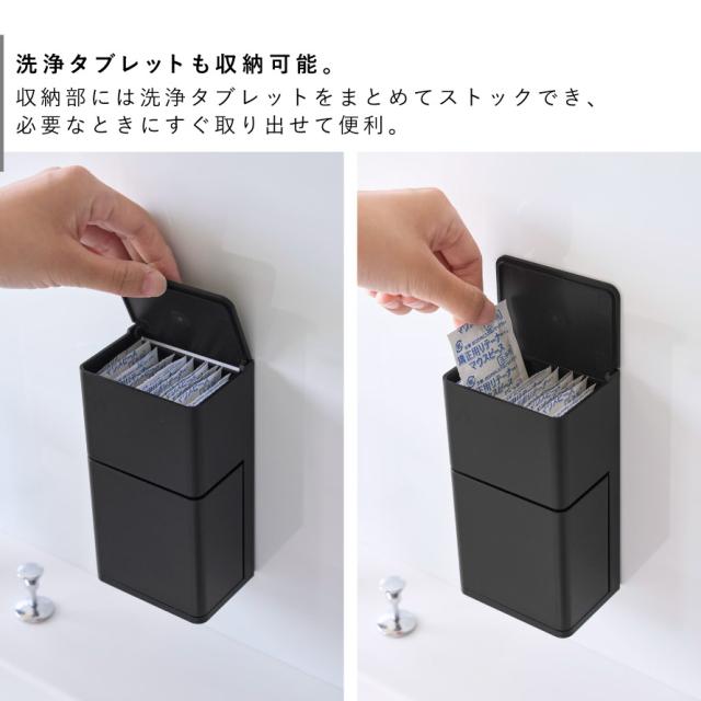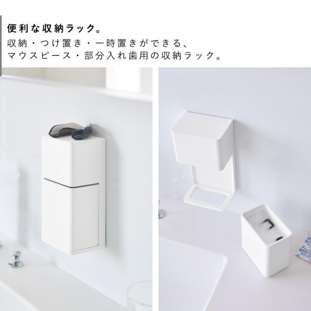 収納・つけ置き・一時置きができる、マウスピース・部分入れ歯・洗浄タブレット収納ラック。収納部には洗浄タブレットをまとめてストックでき、必要なときにサッと取り出せて便利。
