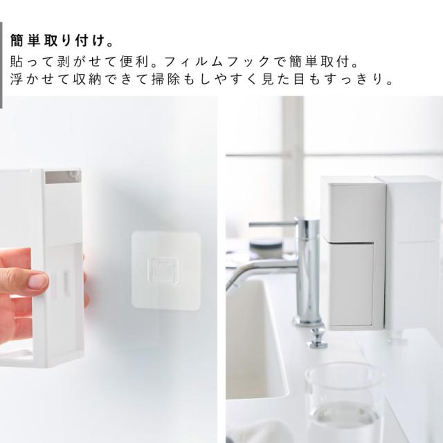 フィルムフックに掛けるだけの簡単設置で、光沢のある壁面やタイルに取り付け可能。浮かせて収納できるため、洗面まわりをすっきり整えながら、お掃除もしやすい設計です。