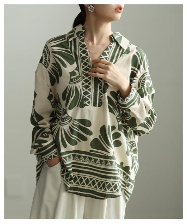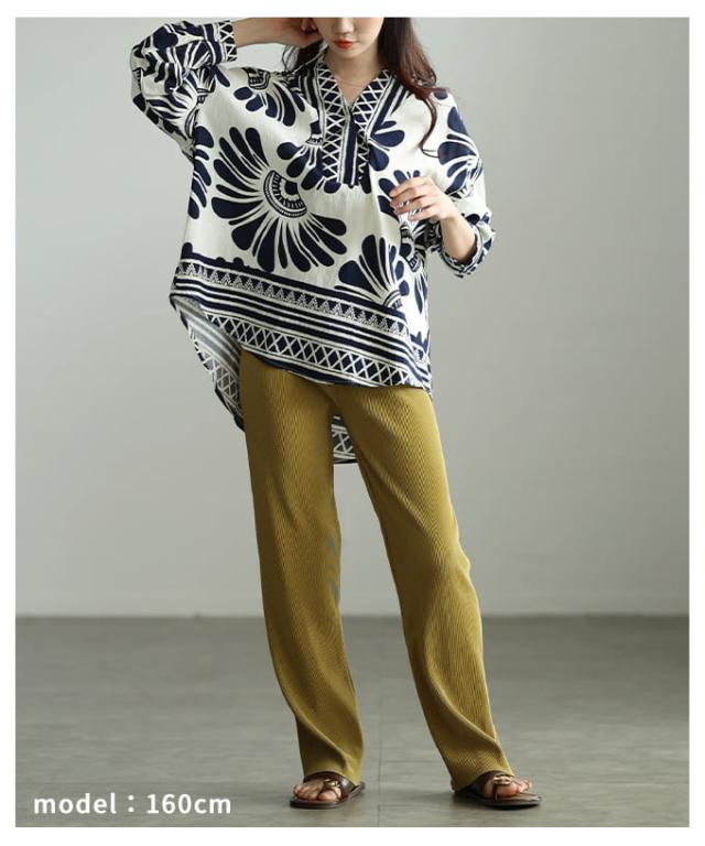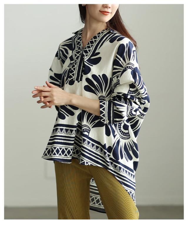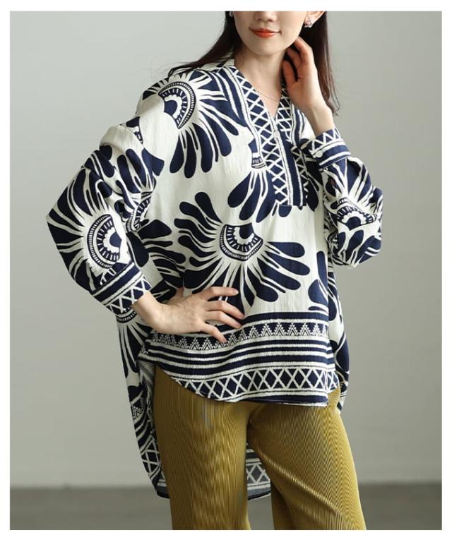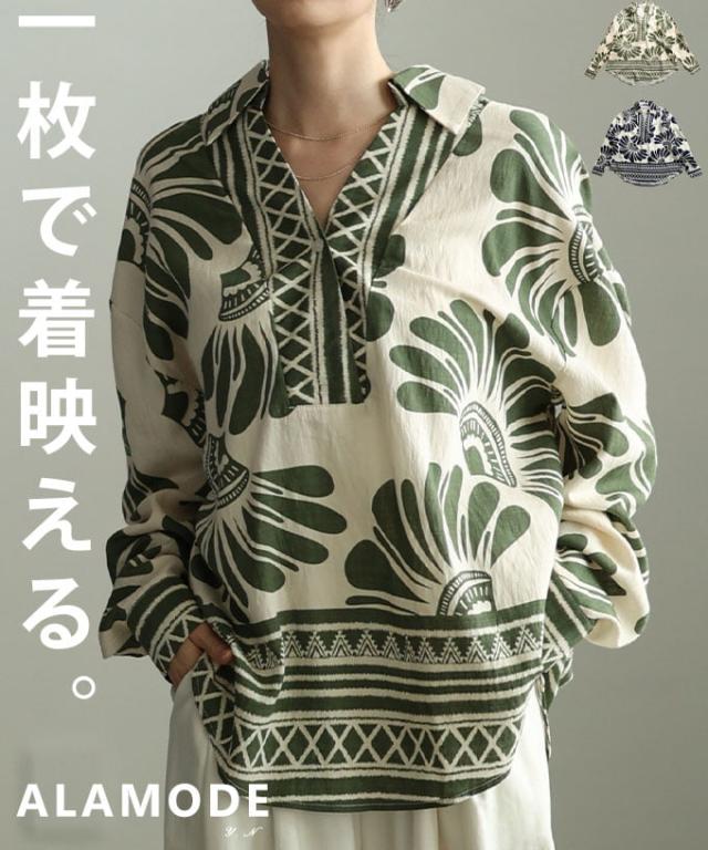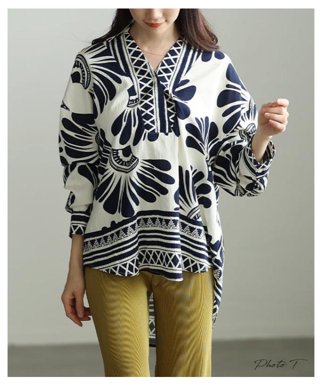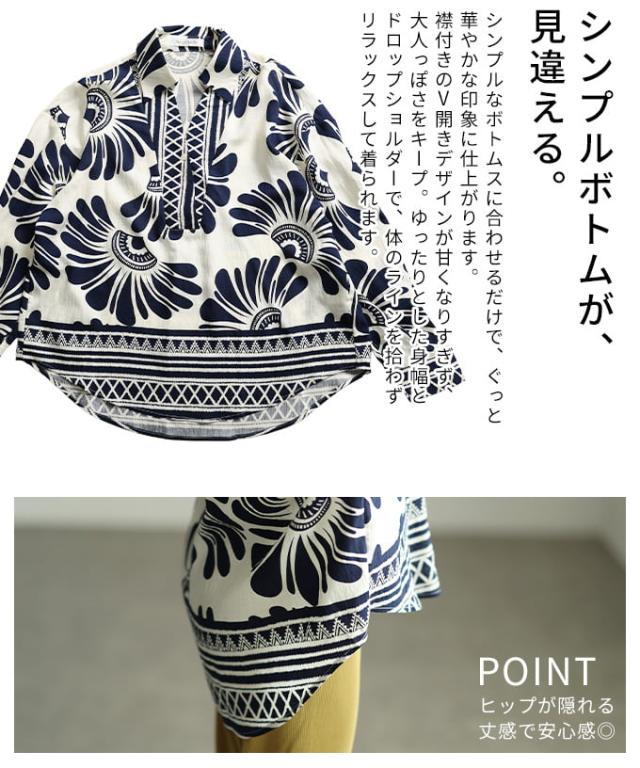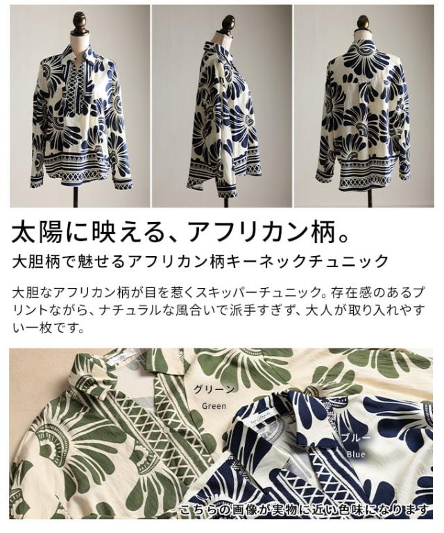 春新作 大胆柄で魅せるアフリカン柄キーネックチュニック レディース トップス 長袖 エスニック柄 総柄 襟付き ドロップショルダー 体型カバー 春 夏 春服 夏服 30代 40代 50代 60代 アラモード alamode otona 大人 cawaii 可愛い 洋服 かわいい服 aljun-1025s