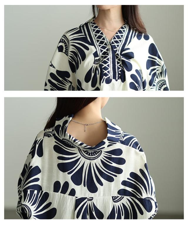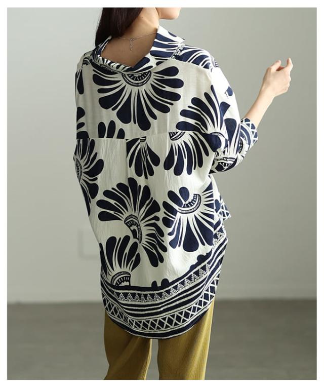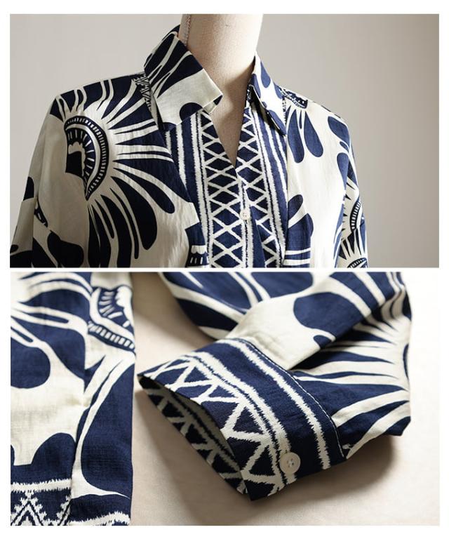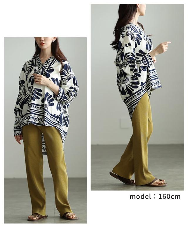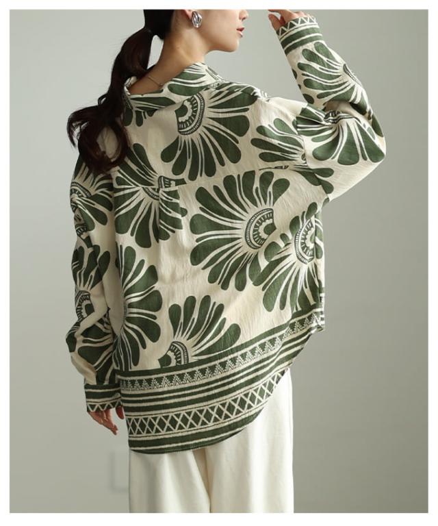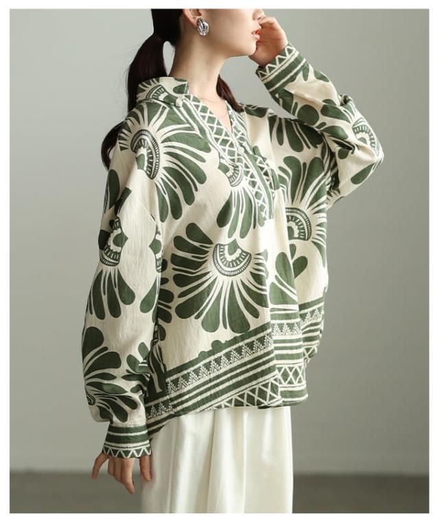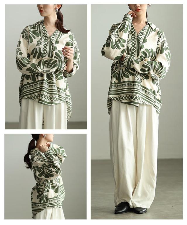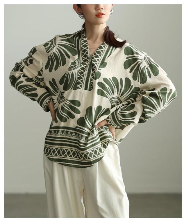 春新作 大胆柄で魅せるアフリカン柄キーネックチュニック レディース トップス 長袖 エスニック柄 総柄 襟付き ドロップショルダー 体型カバー 春 夏 春服 夏服 30代 40代 50代 60代 アラモード alamode otona 大人 cawaii 可愛い 洋服 かわいい服 aljun-1025s