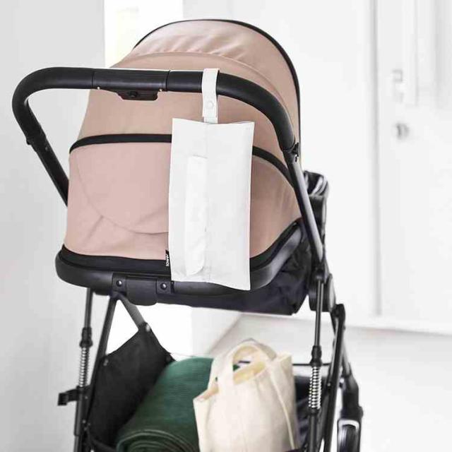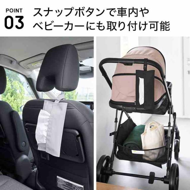 必要な分だけコンパクトに持ち運べる、くず入れ付きティッシュケースです。ソフトパックタイプのティッシュがぴったり収まり、スナップボタン付きのストラップで、ベビーカーのハンドルや車内のシート背面にも取り付け可能。