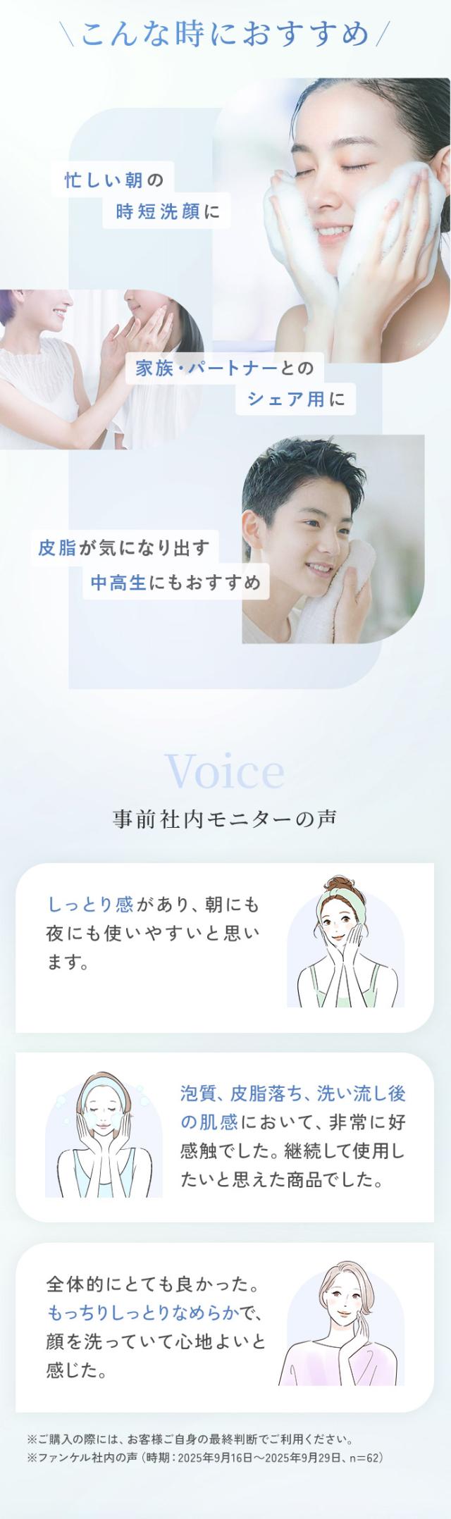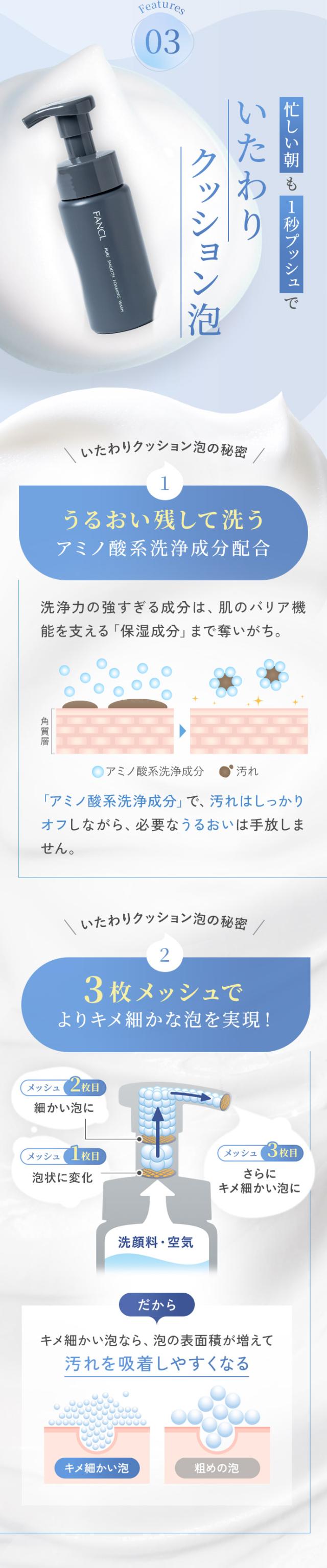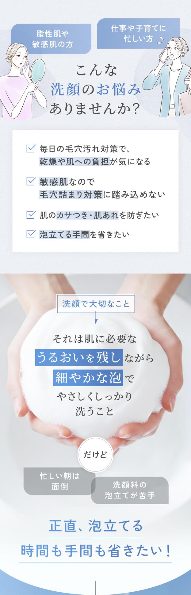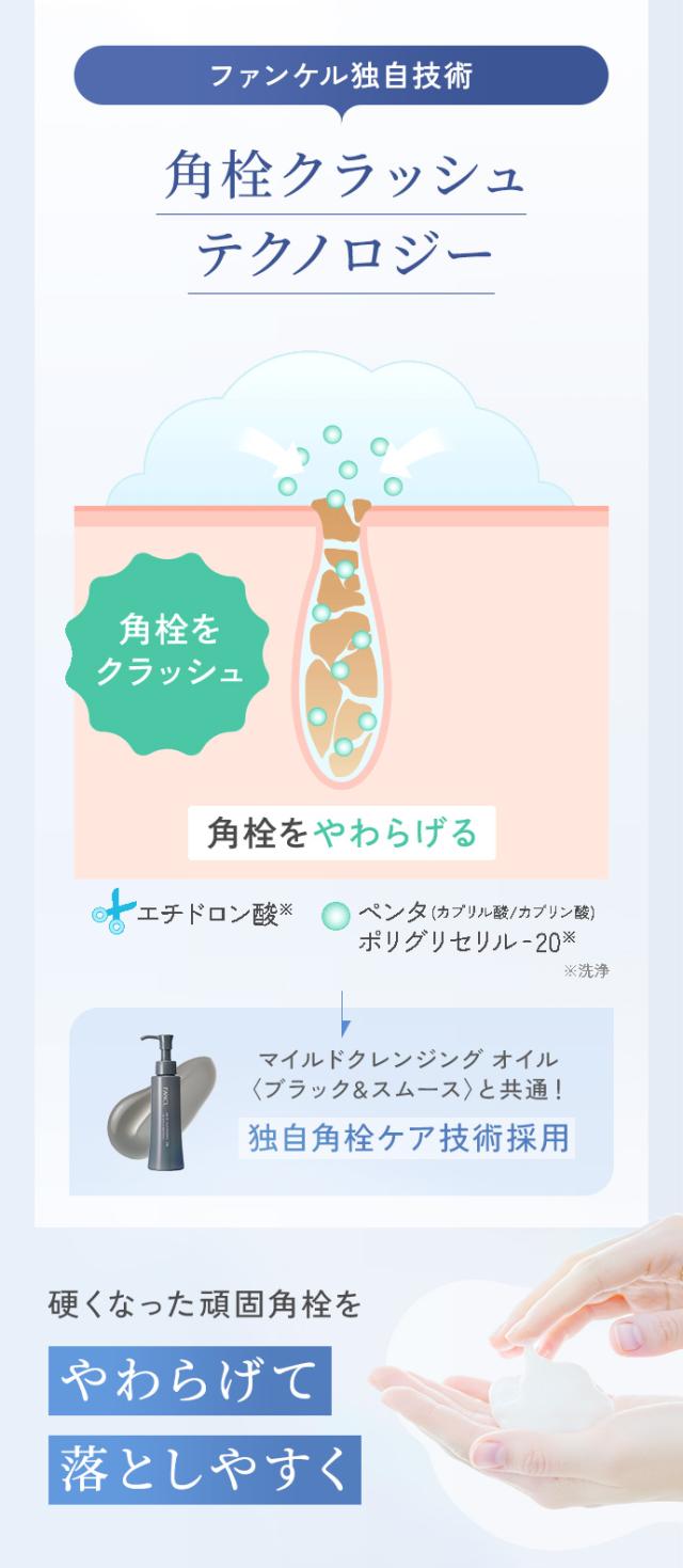 落としにくい角栓をすっきり落としながら、うるおいは残して、ツルツル肌に洗いあげる泡状洗顔料。角栓クラッシュテクノロジーで角栓をやわらげて崩しながら、泡で吸着洗浄。容器に内蔵された3枚メッシュにより、プッシュするだけで簡単にクッション泡をつくることができます。忙しい朝や、お疲れの夜にもおすすめ!