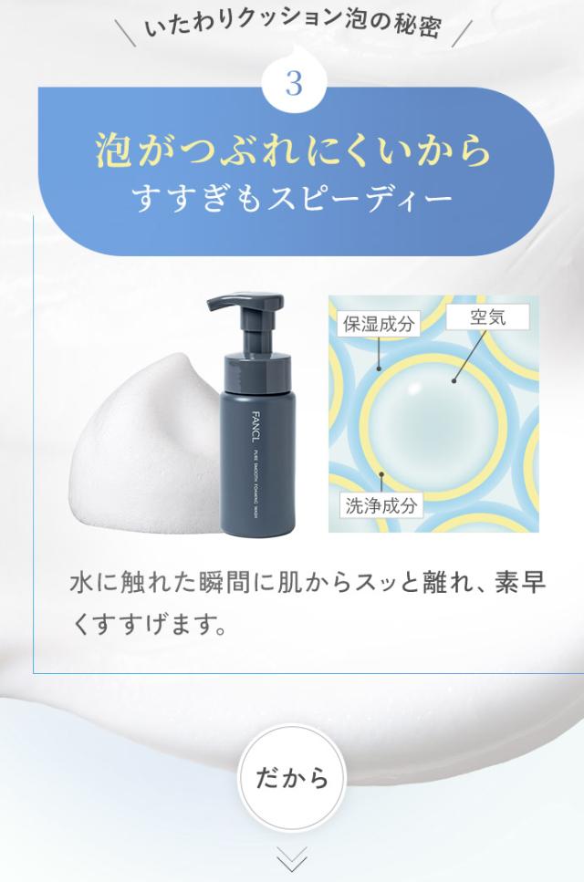 クレンジング ⇒ ピュアスムース泡洗顔料 ⇒ 化粧液 ⇒ エッセンス ⇒ マスク ⇒ 乳液
