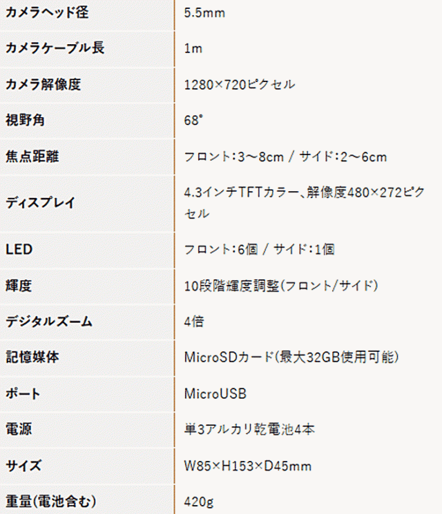 ■ 直径5.5mm、長さ1m、6LED(フロント)/1LED(サイド)内蔵防水型カメラケーブル■ 4.3インチTFT大型ディスプレイ