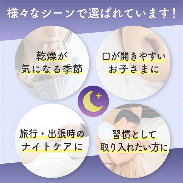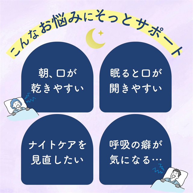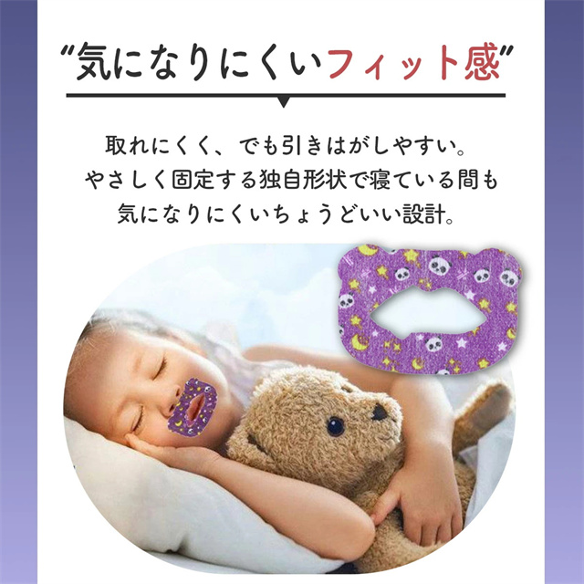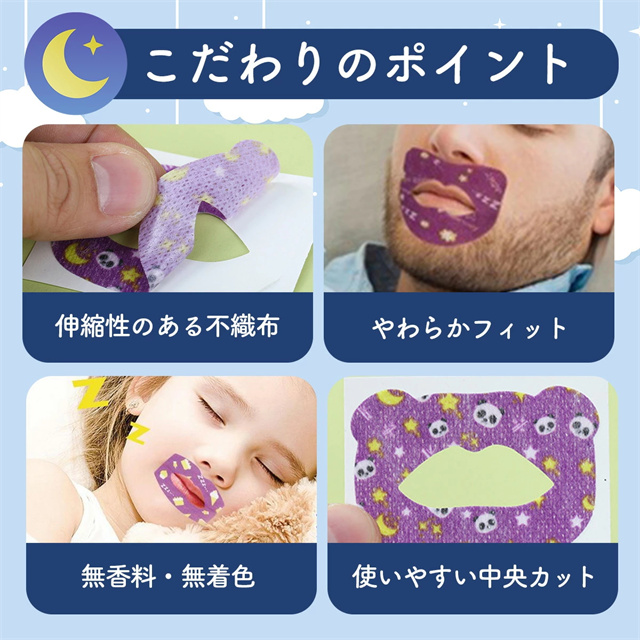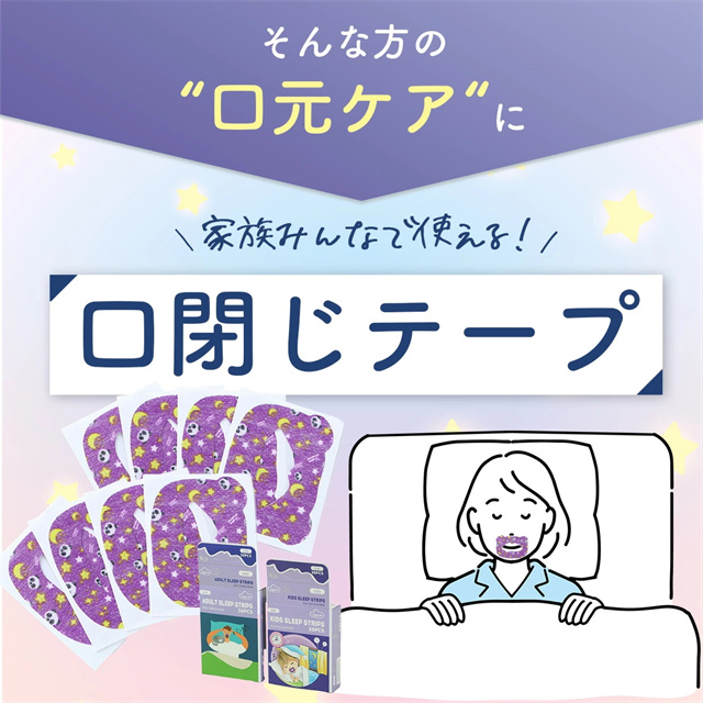| 特徴 | ◆“そっと貼るだけ”おやすみ時間をやさしくサポート♪ ◆可愛いテープで家族みんなの口元ケアに♪ ◆肌に優しい不織布でふわっと軽い着け心地♪ ◆気になるいびきや口が開きやすい方におすすめ♪ |