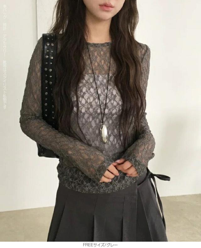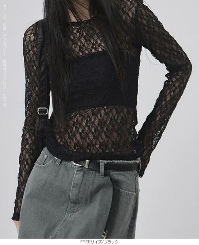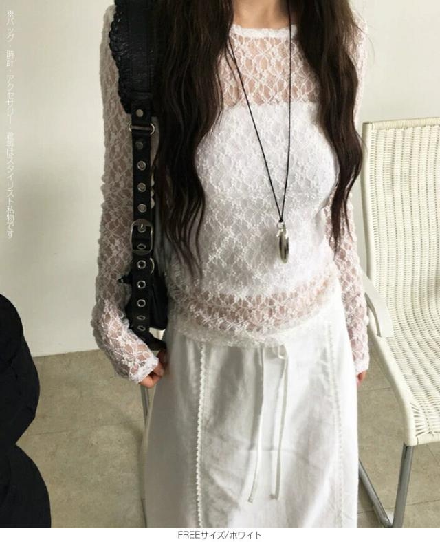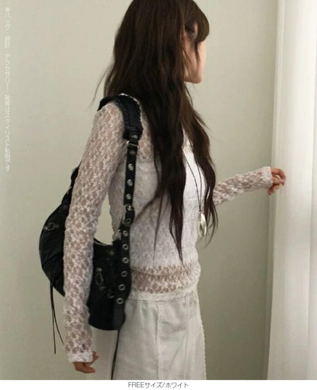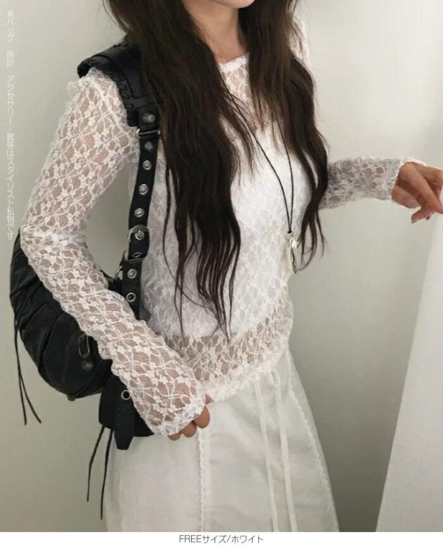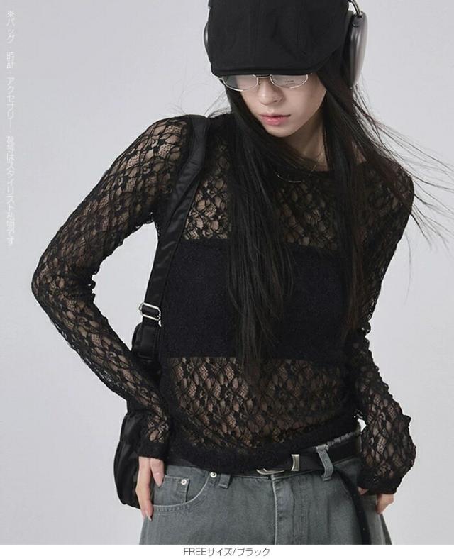 33%OFFクーポン!シアーレーストップス レディース 長袖 透け感 シースルー 総レース レイヤード インナー 重ね着 春 韓国 大人カジュアル 黒 白