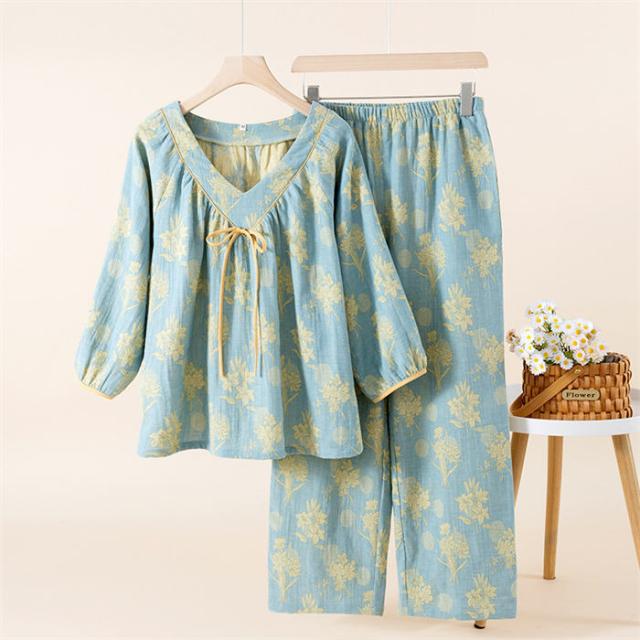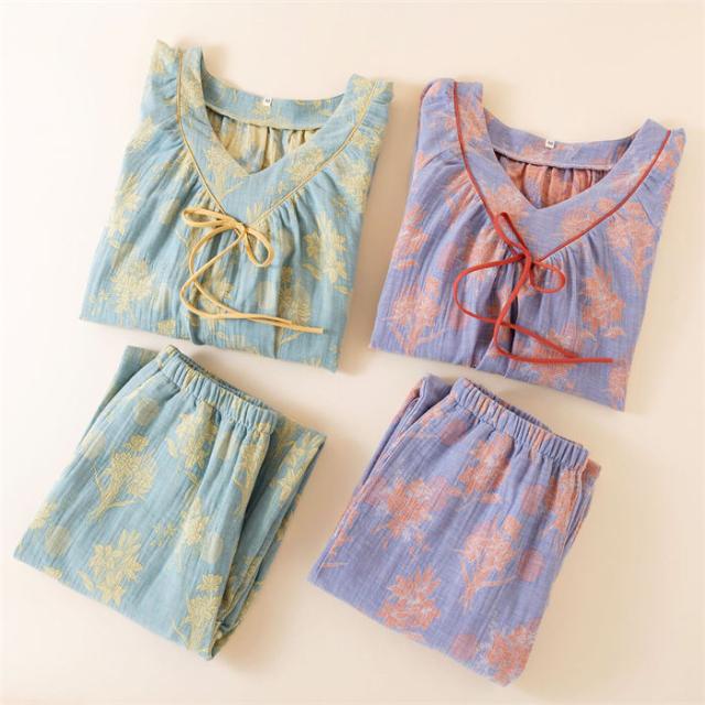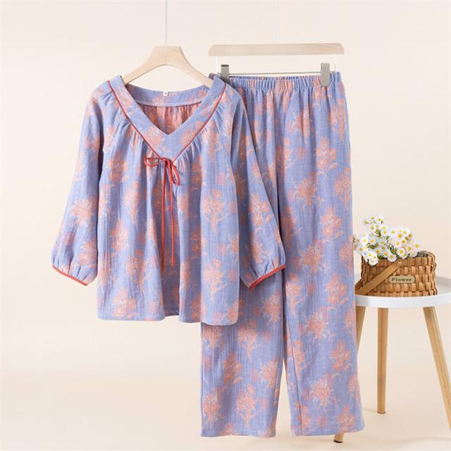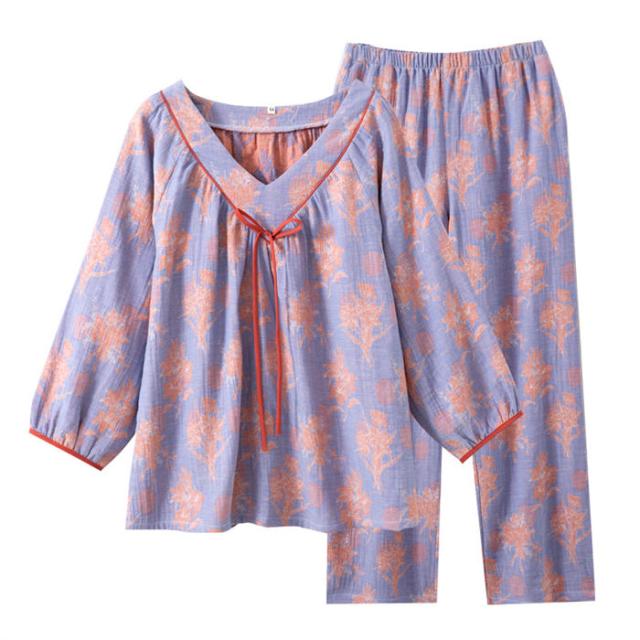 ガーゼ パジャマ レディース ダブルガーゼ ルームウェア 春 夏 秋 長袖 花柄 総柄 ロングパンツ 長ズボン ウエストゴム 部屋着 セットアップ 2点セット 寝巻き 上下セット プルオーバー 寝間着-59