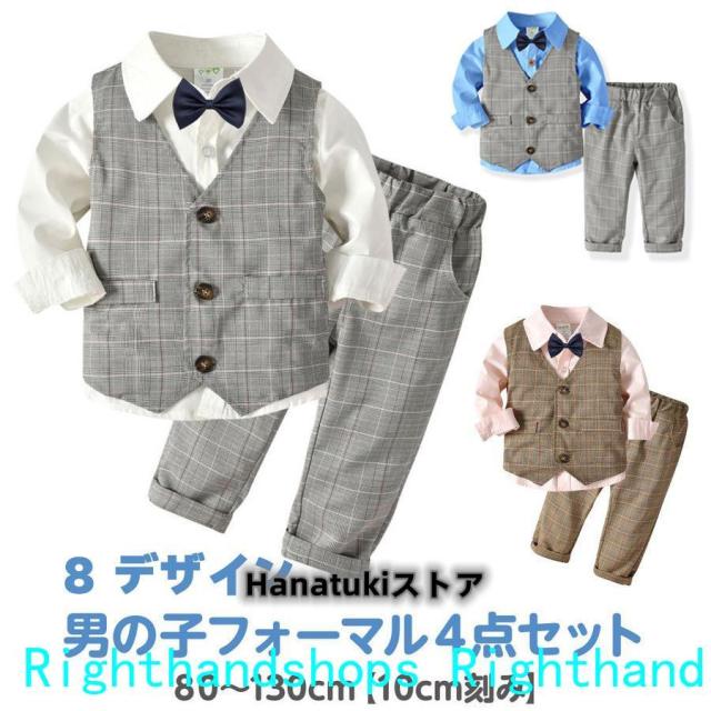 冠婚葬祭は男の子の正装がクール。男の子用フォーマルベスト4点セット。結婚式やお呼ばれ、お誕生日会,パーティーなど何かとイベントが多い時期におしゃれにかわいく主役をキープ。家族写真、お食い初めなどの記念撮影にもインスタ映えもバッチリ。出産祝い、誕生日、お孫さんのプレゼントなどにも喜ばれます。春夏向け素材で快適、ウェストはゴム仕様なので履きやすく、サイズに融通が利きます。サイズは80・90・100 子供の成長に合わせワンサイズ上がオススメ裾や袖折ってもかわいいです。ズボン長め、ウエスト細目です。