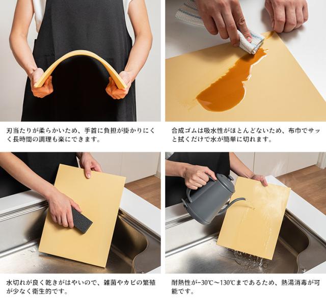 ● 木に近いソフトな刃当たり 木の質感に近い「刃あたりの良さ」と、衛生面に求められる「傷つきにくさ」を高い次元で両立させたまな板。洗いやすく、しかも乾きがとても早くて清潔です。 刃当たりが柔らかいため、手首に負担が掛かりにくく長時間の調理も楽にでき、包丁の刃も傷めにくいです。 ● 傷が付きにくいため、汚れ・臭いが付きにくい 傷が付きにくく、傷が入ってもゴムの特性である弾性によって傷を塞ごうとする力により、カビの原因になる食材カスが詰まりにくいです。 合成ゴムは汚れが付着しにくいため、食材を切っても色移りがしにくく、臭い移りもしにくい素材です。 ● 雑菌・カビに強く、熱湯消毒もOK 合成ゴムは吸水性がほとんどないため、布巾でサッと拭くだけで水が簡単に切れます。 水切れが良く乾きがはやいので、雑菌やカビの繁殖が少なく衛生的です。 耐熱性が-30℃〜130℃まであるため、熱湯消毒が可能です。熱による変質・変形しにくく安心です。 |