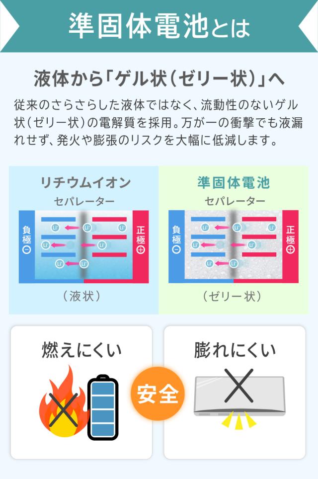 従来の液体電池と違い、中身が漏れにくく電解質がゲル状の「準固体」を採用衝撃による発火リスクを極限まで抑えています。