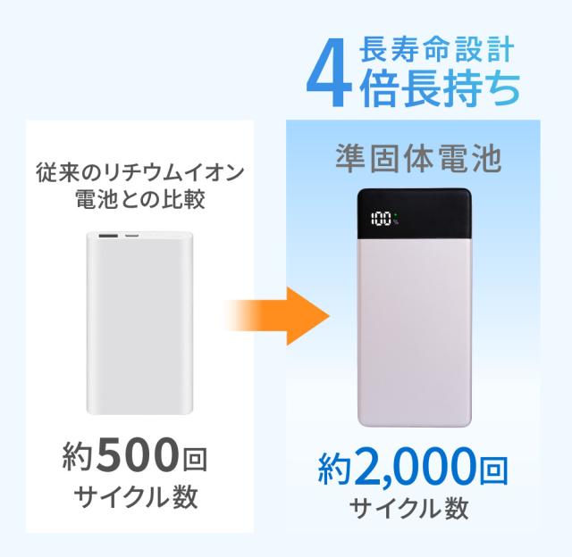 既存の液体ポリマーバッテリーと比較して、約4倍以上の充電サイクル(約2,000回※)を実現。