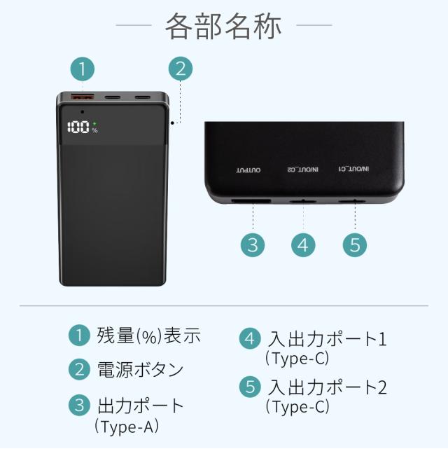 出力端子 USB Type-A(メス)×1、USB Type-C(メス)×2 ※入力端子と兼用(複数ポート同時使用15W)
