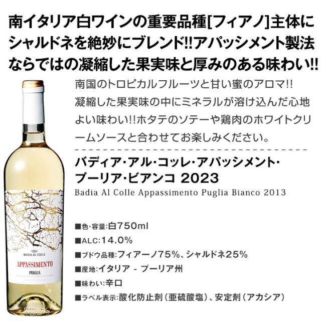 当店大人気ワイナリー≪チウ・チウ≫の極旨パッセリーナに、ピエモンテの銘醸白ワイン[ガヴィ]を産み出す高級ブドウ品種コルテーゼの激旨!!そして!!凝縮した果実味と厚みのある味わいが楽しめるプーリアのアパッシメントに、シチリア・オーガニック栽培の先駆けワイナリーが手掛けるカタラット!!さらに!!4世代に渡る歴史を持つファミリーカンパニーが放つ激旨に、≪堂々のダブル金賞!≫南イタリア屈指の人気産地プーリアの激旨トレッビアーノ!!人気のイタリア各地から、激旨白ワイン6本をセレクトいたしました!!バラエティ豊かなイタリアワインの個性をご満喫ください!!