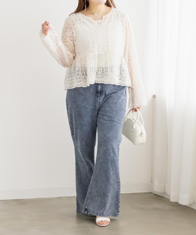 | 3Lサイズを着用して丁度良い着用感でした。フレアシルエットが脚のラインをきれいに見せてくれて、スタイルアップ効果も抜群な1本です! 加工感が今っぽくて、コーデに取り入れるだけで一気にトレンド感が出ます◎シンプルなアイテムと合わせてもおしゃれ見えが叶います。 生地は程よく軽めのデニムで、動きやすさも◎ デイリーコーデにピッタリな1本です。 |