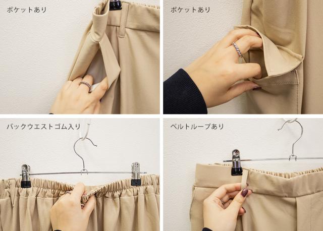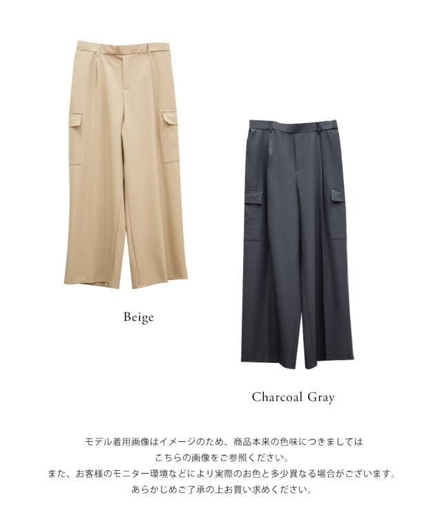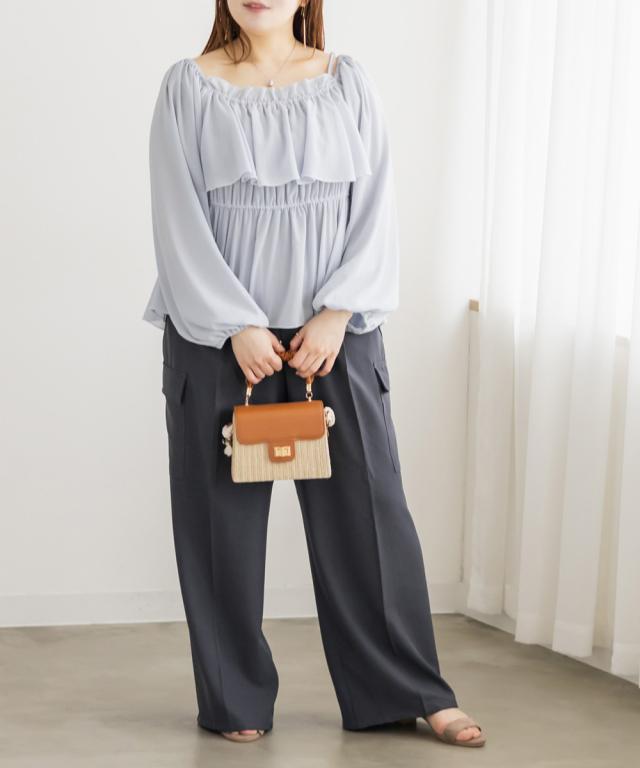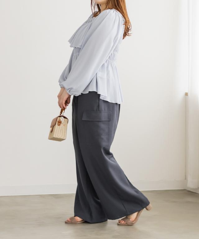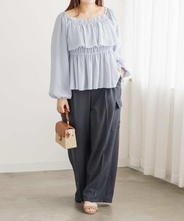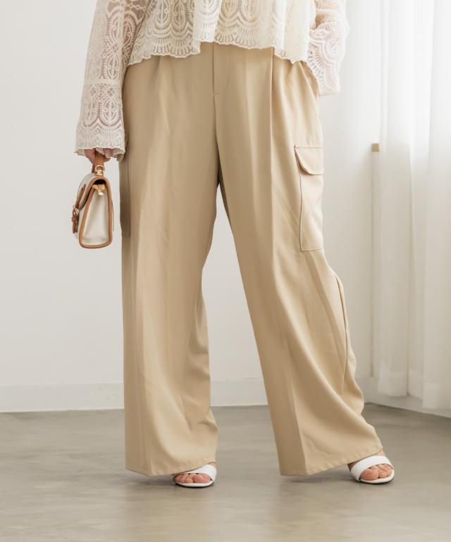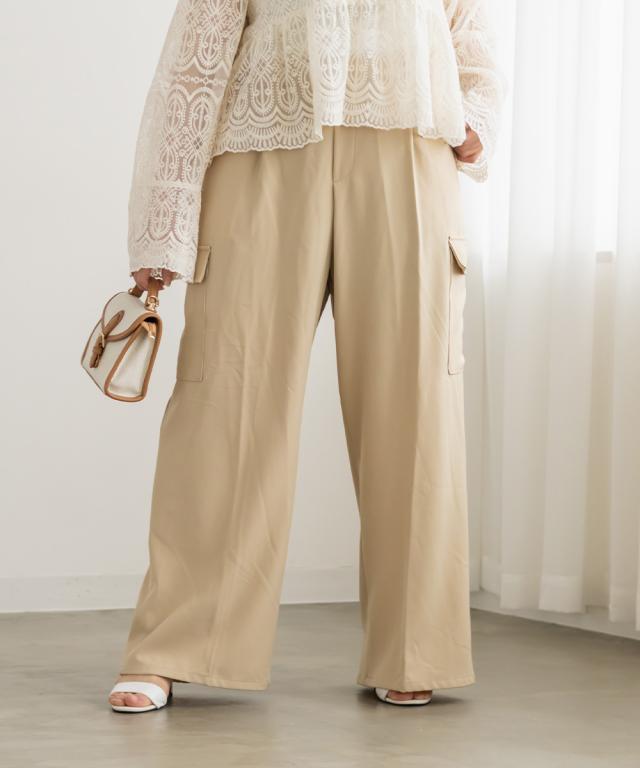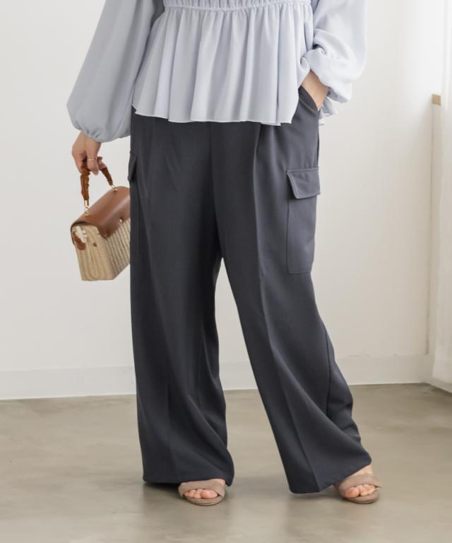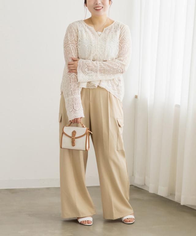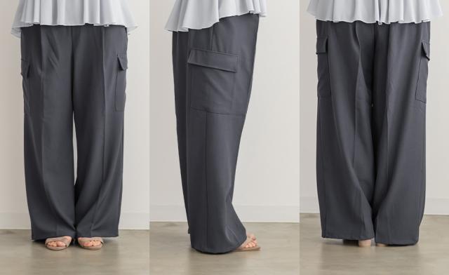 | 3Lサイズを着用しました。ウエストは程よくフィットし、全体的にちょうどいい着心地でした。ワイドシルエットで脚のラインを拾いにくく、リラックス感がありながらもきれいめに見えるのが嬉しいポイント♪ タック入りなのでお腹まわりもすっきりとした印象に仕上がります。 カーゴデザインのポケットがアクセントになり、シンプルなトップスと合わせるだけでこなれ感のあるスタイルに◎ ブラウス合わせで大人カジュアルに、コンパクトトップスと合わせてバランス良く着こなすのもおすすめです。程よいトレンド感がありつつ、着回し力の高いパンツだと思いました。 |
