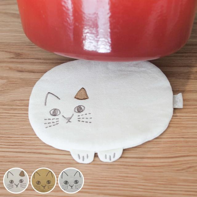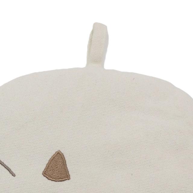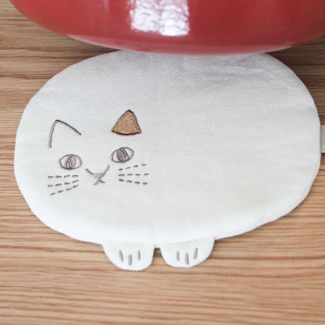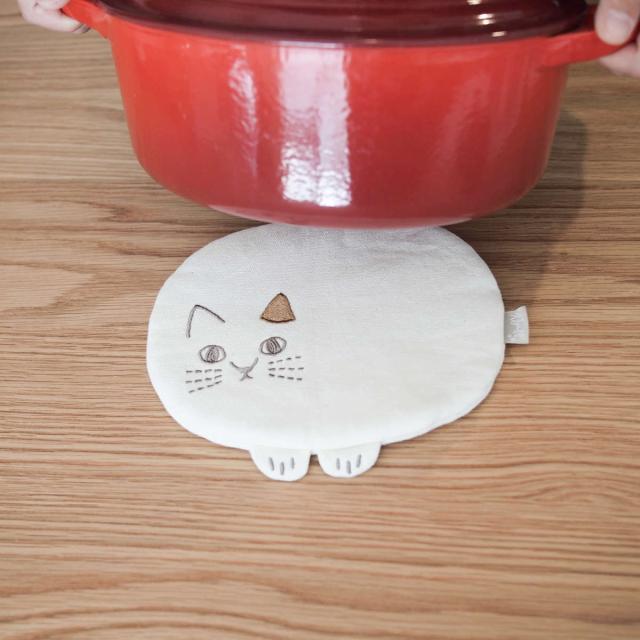 猫の顔をモチーフにしたやさしいデザインで、置いてあるだけで気分がふっと和らぐにゃふにゃふなべつかみです。愛らしい表情とちょこんと出た前脚がなんともかわいらしく、見ているだけで癒されます。料理中も思わず笑顔になるアイテムです。